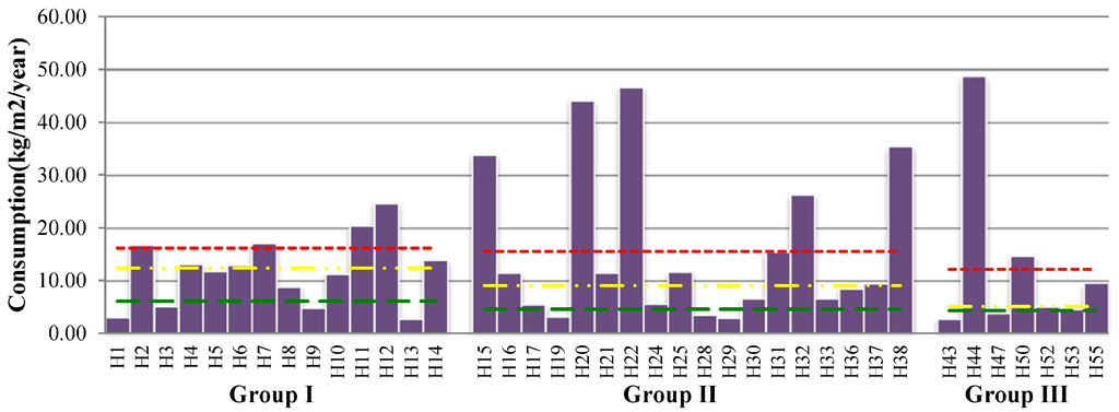 Rather than be based on empirical data or on the performance level of a small group of buildings that are considered representative of good practice in Portugal, the method presented in this paper is based on a total sample of 55 public and public-private partnerships healthcare buildings in Portugal. The statistical analysis of the survey results showed that annual consumption of resources, production of waste, and potential environmental impacts would be better correlated with the net floor area of healthcare buildings. Nevertheless since there are different types of hospitals, covering very different health services coverage and with different net floor area, it was necessary to group the hospitals into three different groups (Group I, Group II, and Group III). Therefore, different benchmarks were developed for each hospital group.