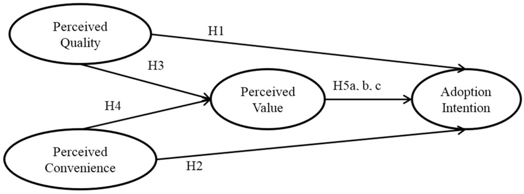 H5b: Perceived value partially mediates the relationship between perceived quality and public bicycle sharing systems adoption intention.H5c: Perceived value partially mediates the relationship between perceived convenience and public bicycle sharing systems adoption intention.