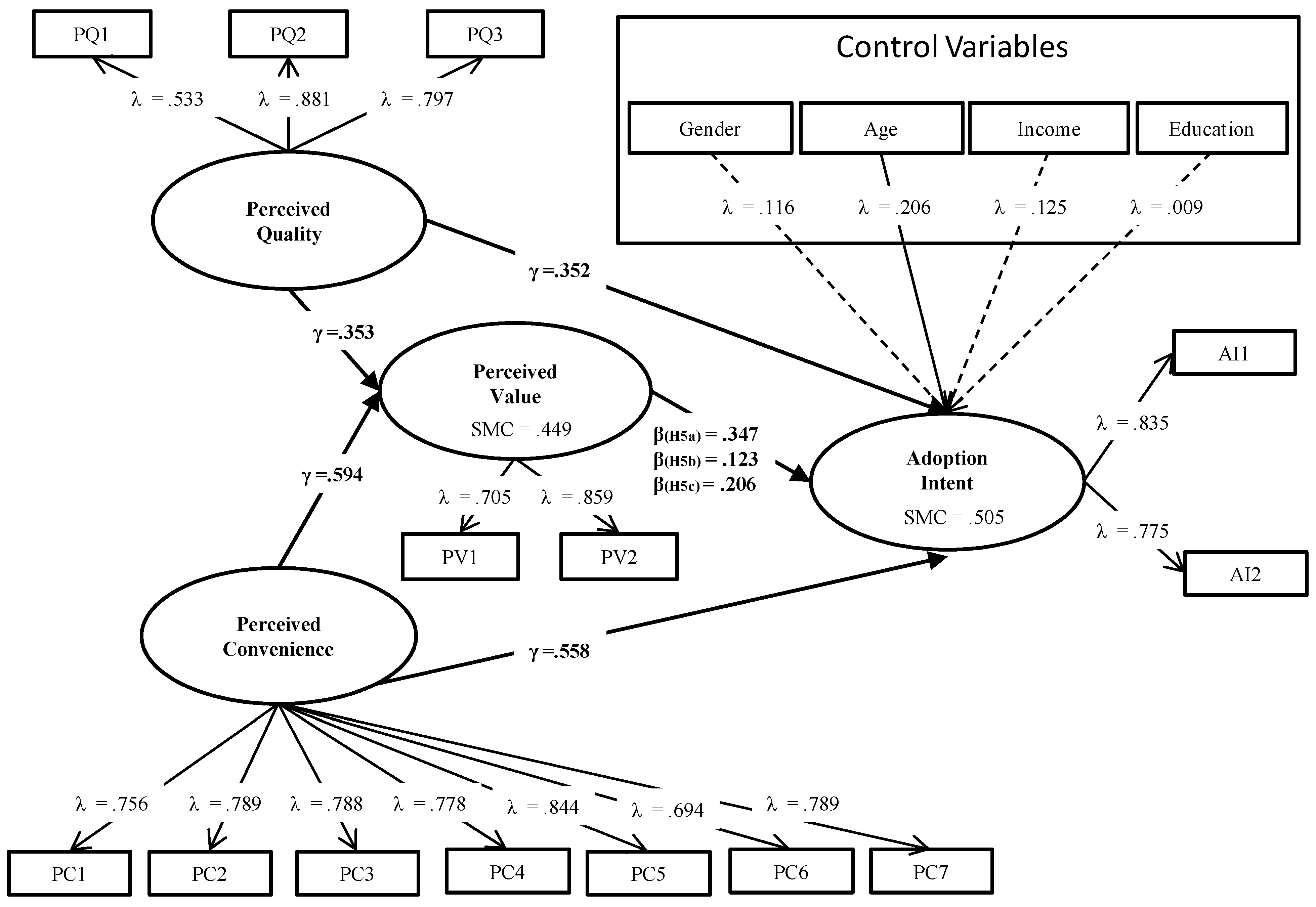 H5b: Perceived value partially mediates the relationship between perceived quality and public bicycle sharing systems adoption intention.H5c: Perceived value partially mediates the relationship between perceived convenience and public bicycle sharing systems adoption intention.