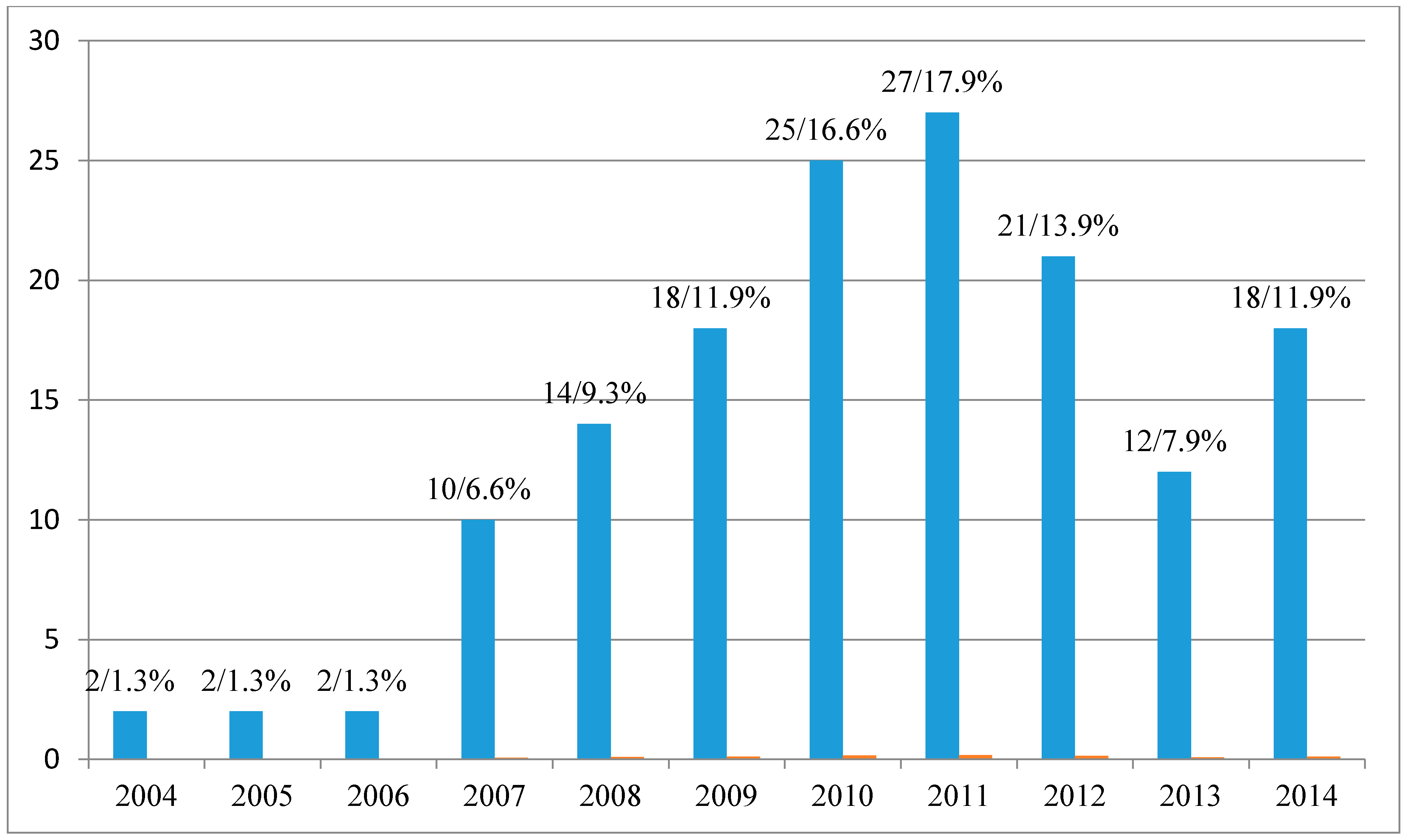 Figure 1 presents the sample distributed by year. The results show that the year 2011 yielded most publications, with 27 papers accounting for 17.9%. In addition, the number of the publications shows an increasing tendency during the period 2004–2011. To some extent, the results suggest that SCF has received more and more attention in the past decade.