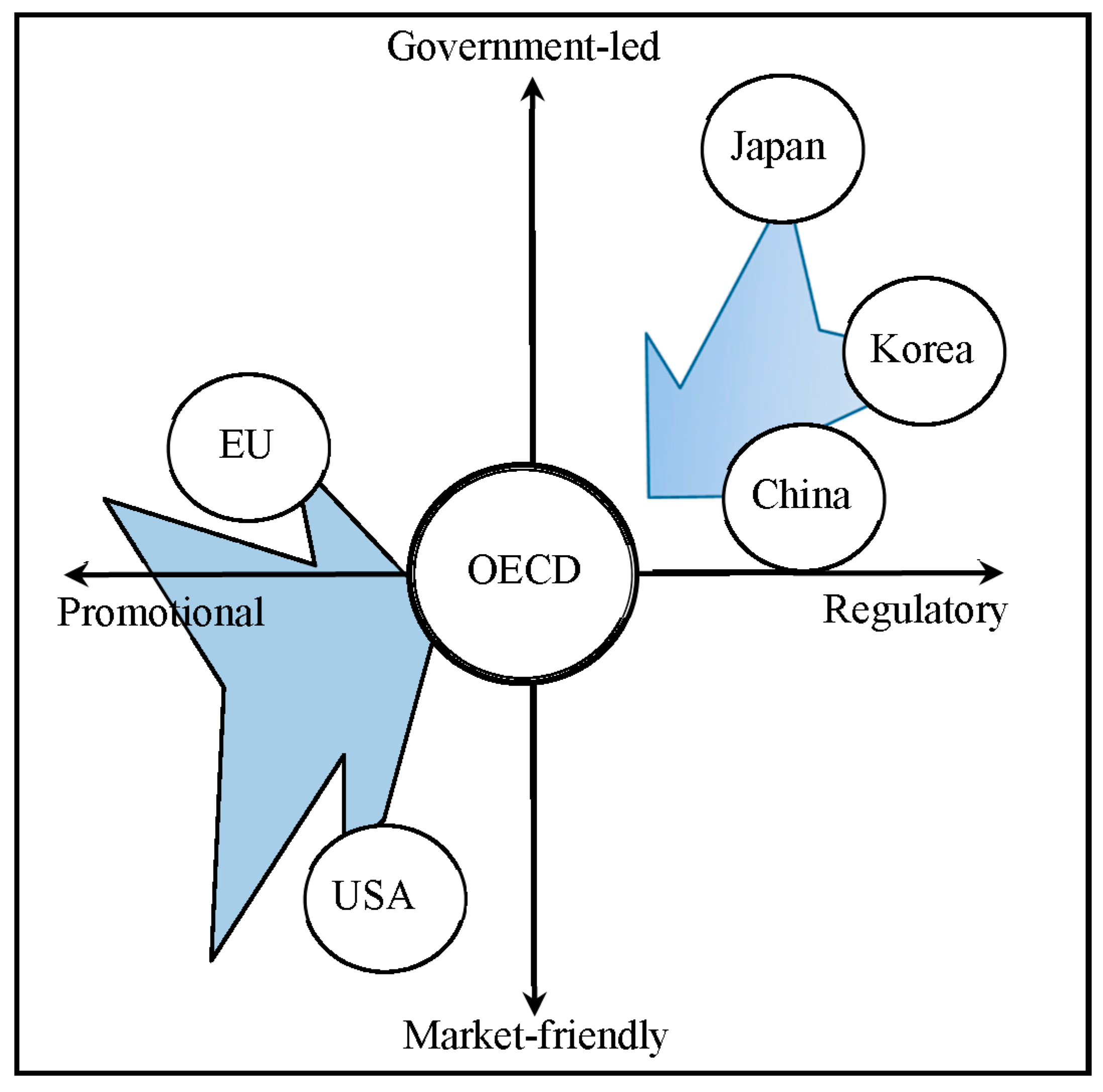 17]. Moreover, the major companies in Korea, such as Samsung and Hyundai cars, are more aware of global competitiveness than local political pressure, because the Korean economy is based on international trade with an export-oriented economic structure. Therefore, the regulatory regime toward green growth is no longer efficient and effective in this innovation-oriented and very complicated economy.