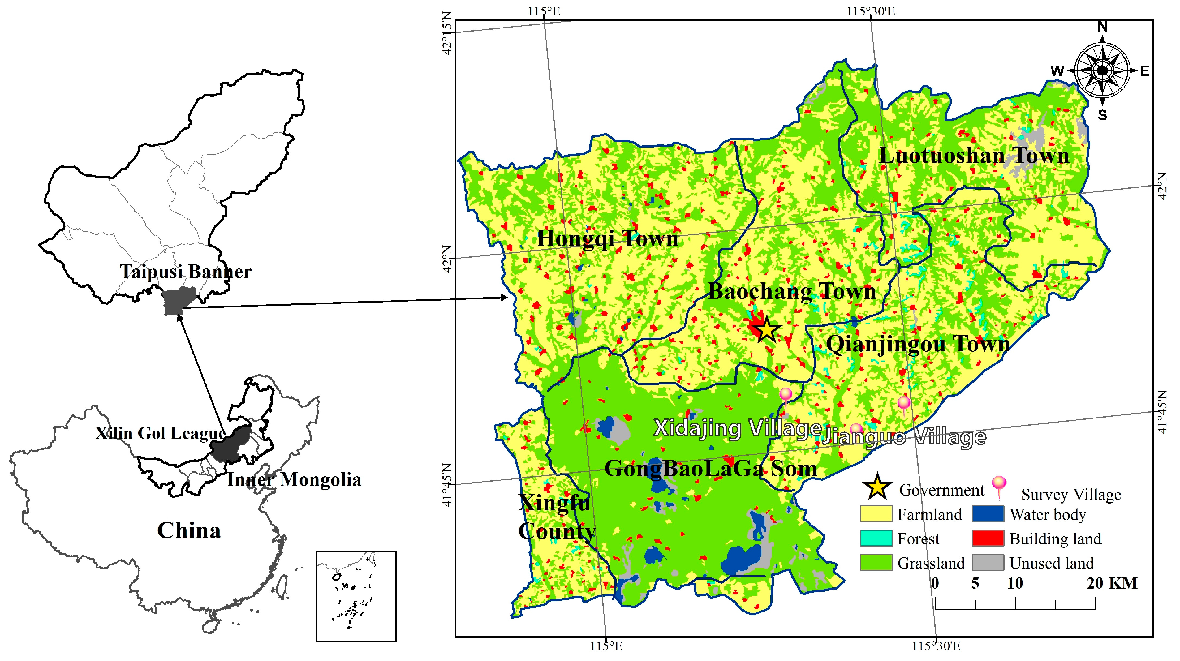 - Qianjingou Town in Taipusi Banner. The basic information of Taipusi Banner. Available online: http://www.tpsq.gov.cn/xhqgk_1/zjxhq/smz/200811/t20081107_177655.html (accessed on 29 October 2015). (In Chinese)