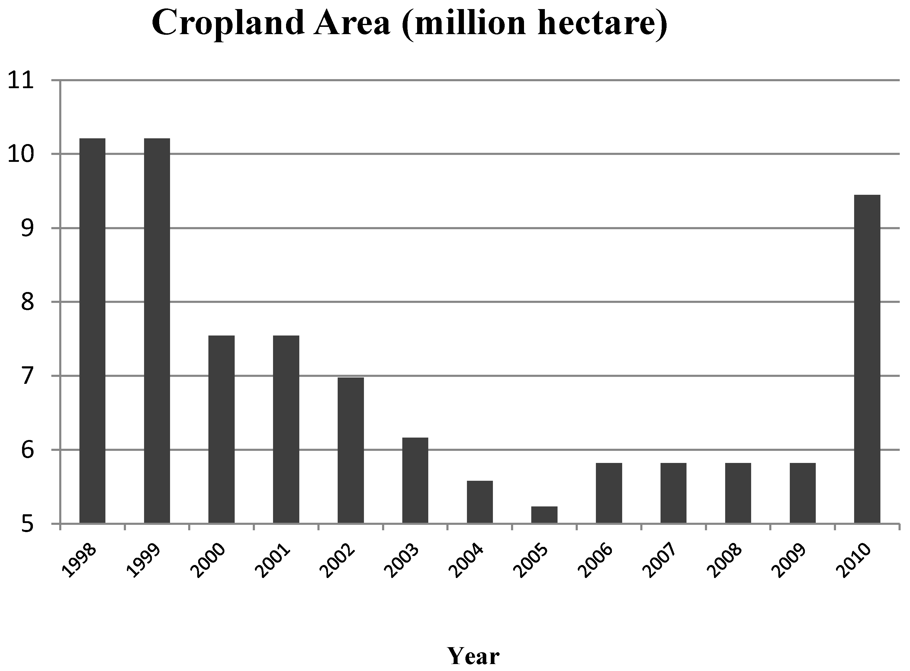 - Calculating the farmland areas of each person using the statistical yearbook data. Using remote sensing data, we obtained the spatial location of the farmland and resized the grid resolution so that one farmland grid represented one person’s farmland area.