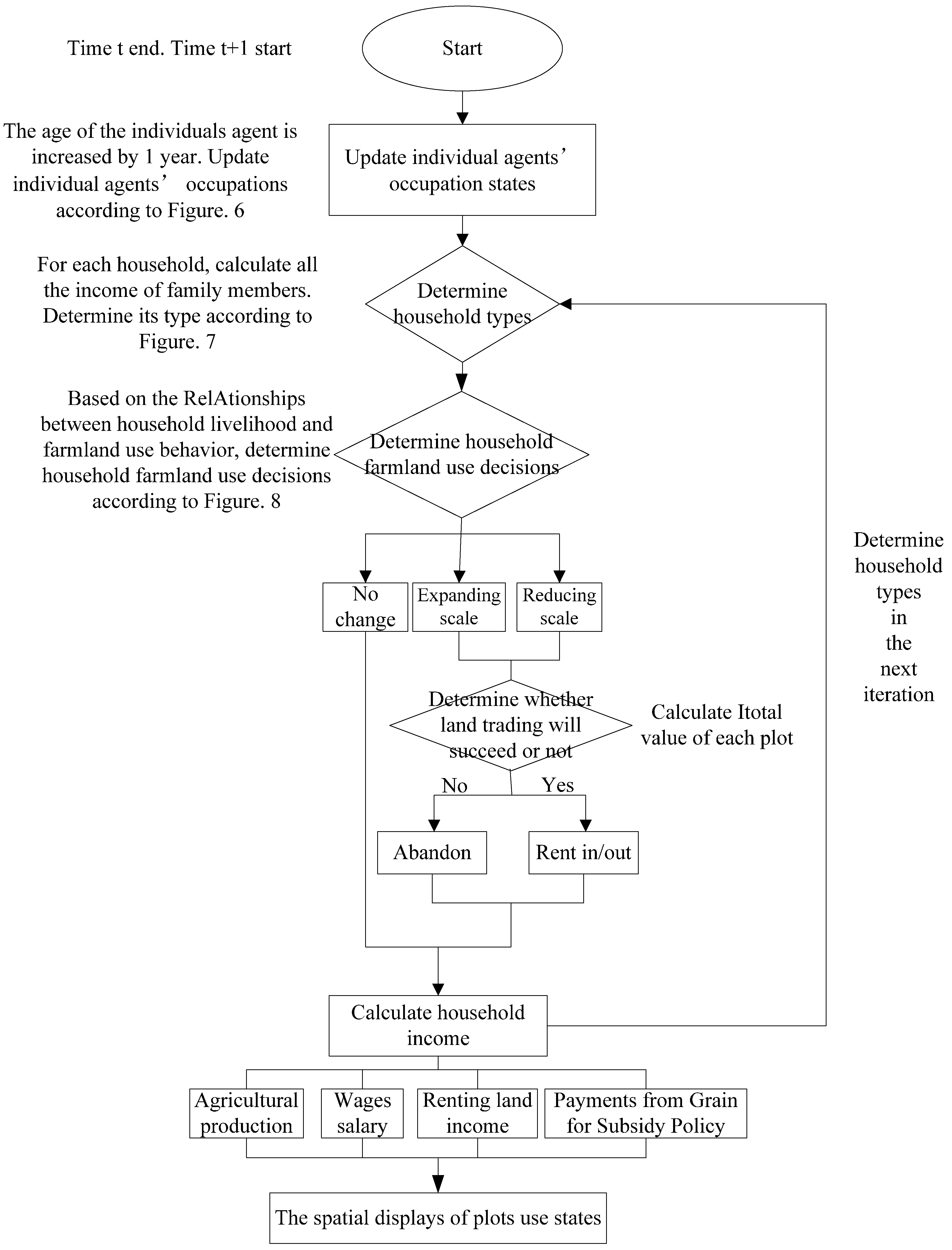 - The age of the farmers retiring node is 65 years. When the age of an individual agent is equal to or greater than 65, farmers will stop farming activities (S6→S9).