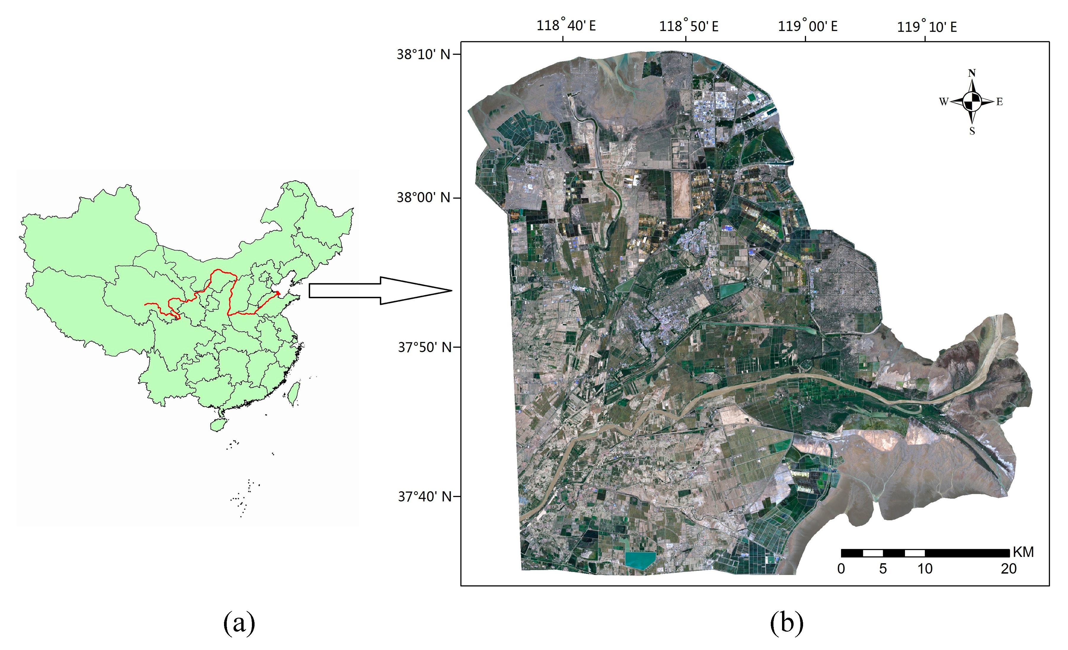 21]. It is located at the northeast of Shandong Province and is home to many valuable coastal wetlands together with China’s second largest oil field, Shengli Oil Field. Due to intensive human activities and global climate change, the Yellow River Delta has been experiencing many challenges, including sea level rise, water discharge decrease, soil salinization and fertile decline, wetland loss and fragmentation, to name a few