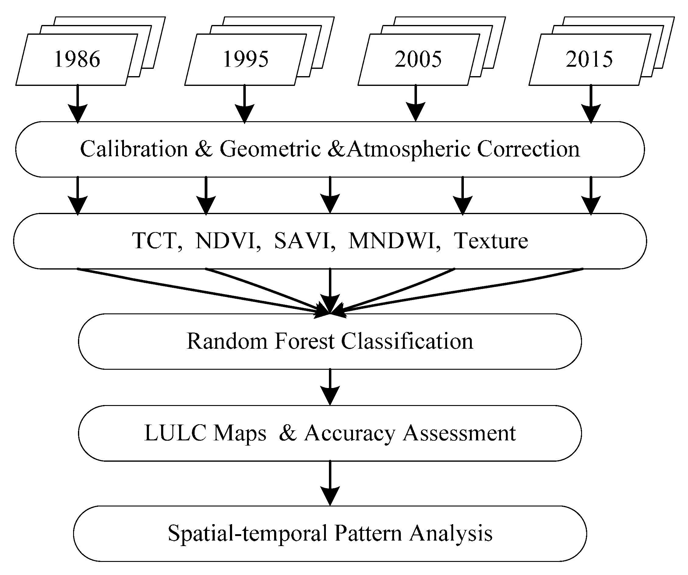 33], which satisfies the above requirements, was selected in this study for the classification of the multi-temporal Landsat data. Additionally, random forest has been rarely documented in the LUCC of the Yellow River Delta and other ecological studies (e.g., forest biomass estimation, chlorophyll-a concentration of the water body), and its performance should be justified.
