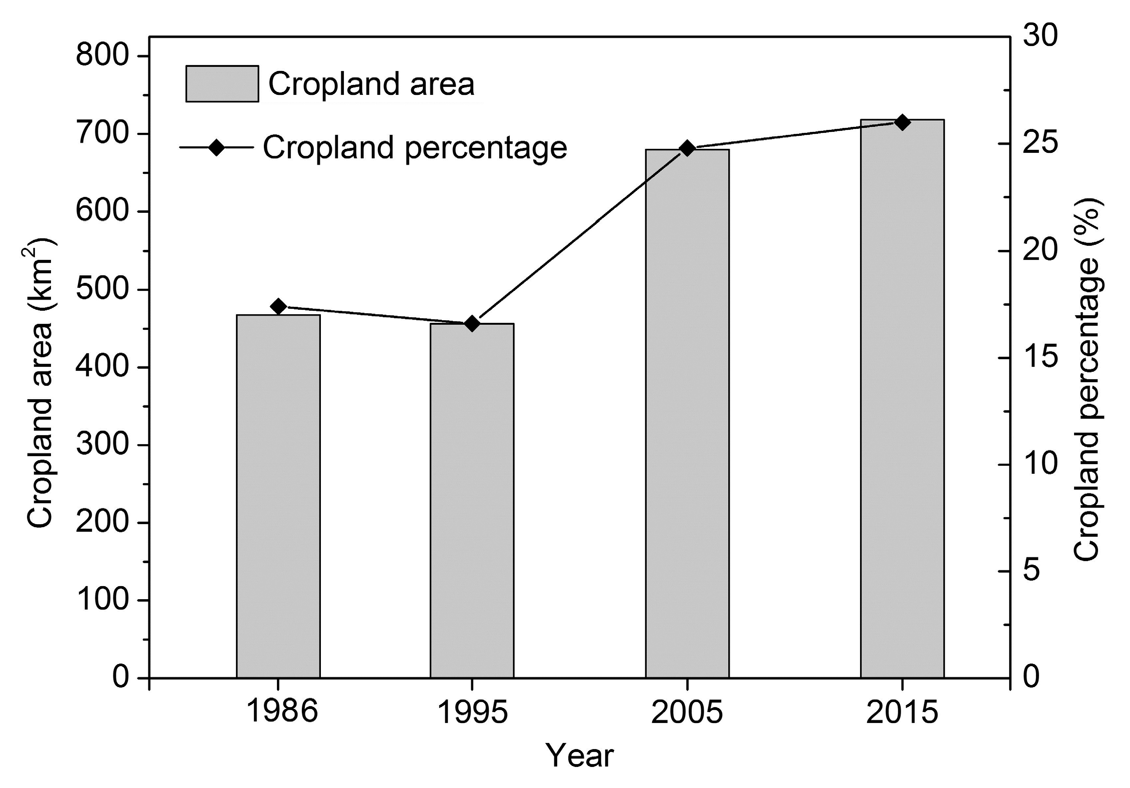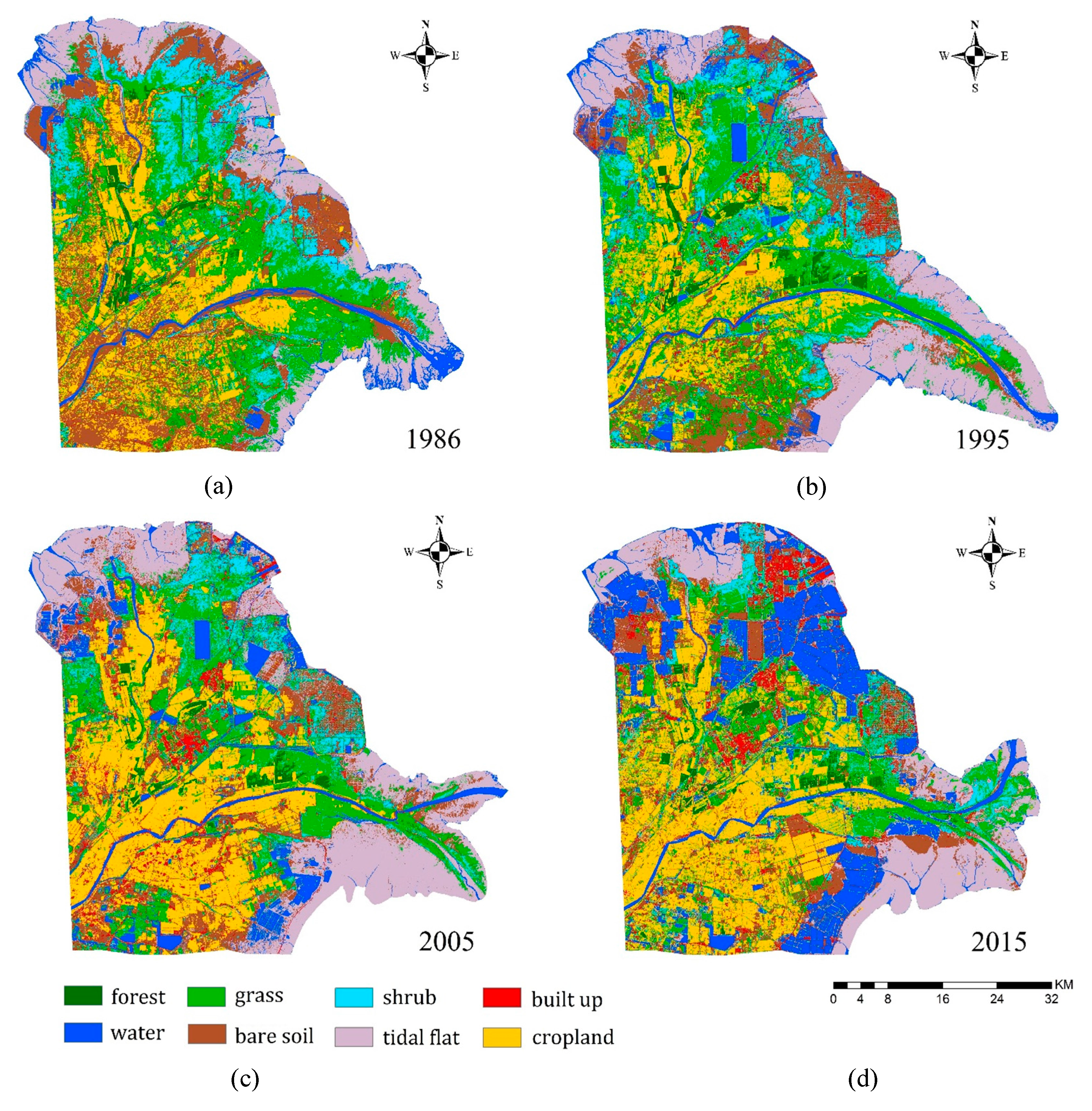 29], we studied the cropland dynamics of the Yellow River Delta from 1986 to 2015 (present) using satellite remote sensing techniques. Meanwhile, the previous studies [