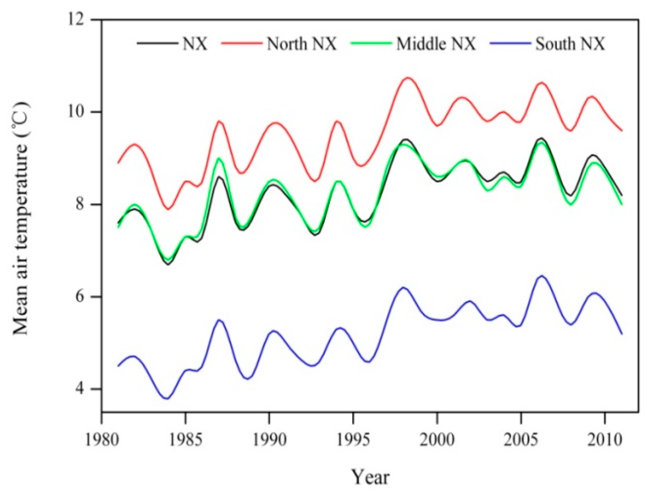 - Yuan, H.Y.; Zhang, X.Y.; Xu, H.J.; Yang, X.G. Changes of China agricultural climate resources under the background of climate change V. Change characteristics of agricultural climate resources in Ningxia. Chin. J. Appl. Ecol. 2011, 22, 1247–1254. (In Chinese) [Google Scholar]