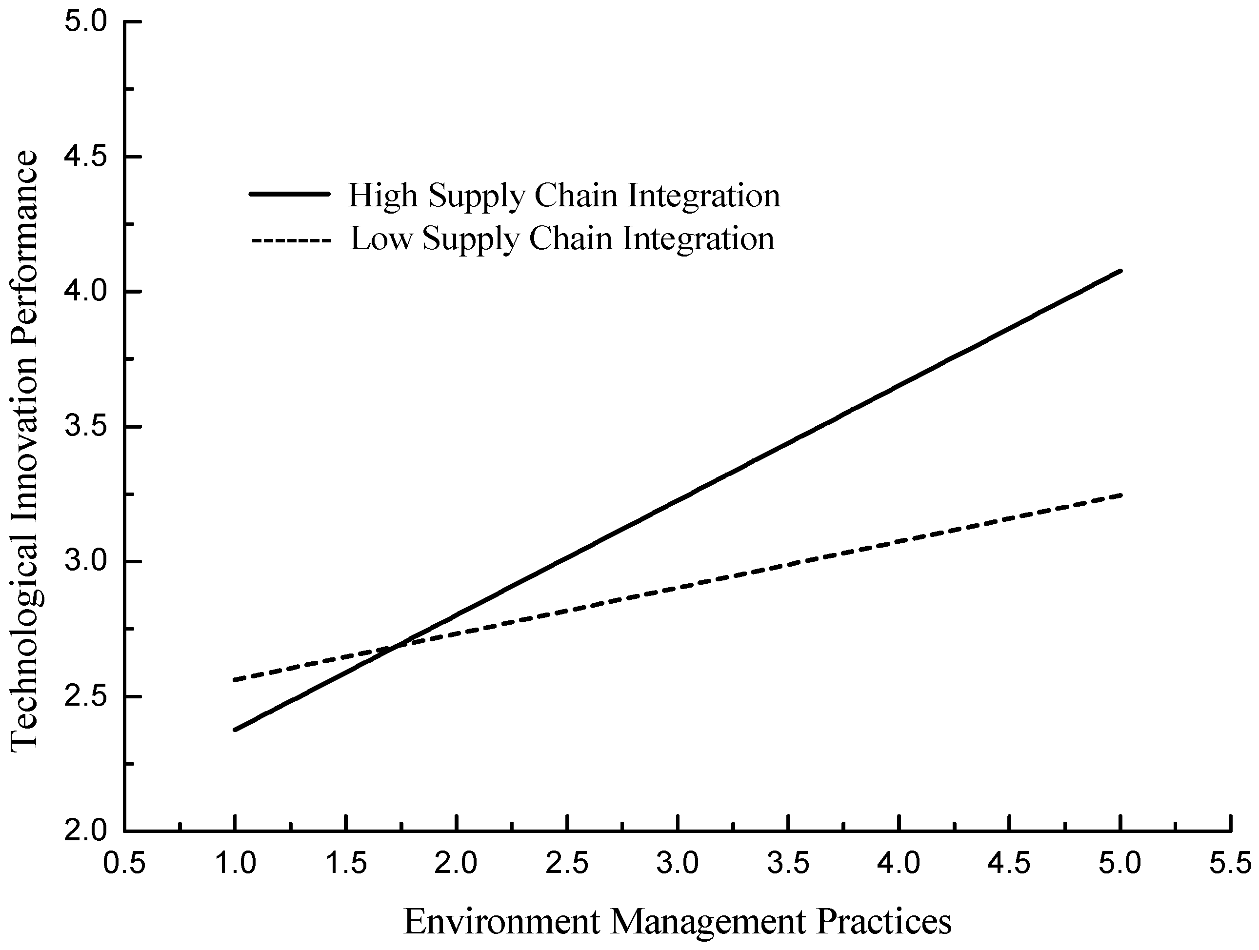 Supply chain integration is not only an antecedent of technological innovation performance; it also could become a condition under which environmental management practices impact on technological innovation performance. Llerena (1999) [56] and Avadikyan (2001) [57] indicated that organizational learning and inter-organizational cooperation mechanisms were obviously related to the relationship between environmental management and innovation. Cai and Zhou (2014) [58] found that supply chain integration meant good communication, trust, and cooperation among supply chain members, which had a direct impact on the establishment of supply chain collaboration network and the inter-organizational learning. According to RV of RBV theory, the network propagated by supply chain integration, as an advantage resource, could promote organizational learning and knowledge sharing and cooperation among supply chain partners [12,59]. Thus, firms with higher level supply chain integration can get more tacit knowledge and product life cycle knowledge from environmental management practices and have more inter-organizational learning and collaboration opportunity to apply this knowledge for technological innovation.