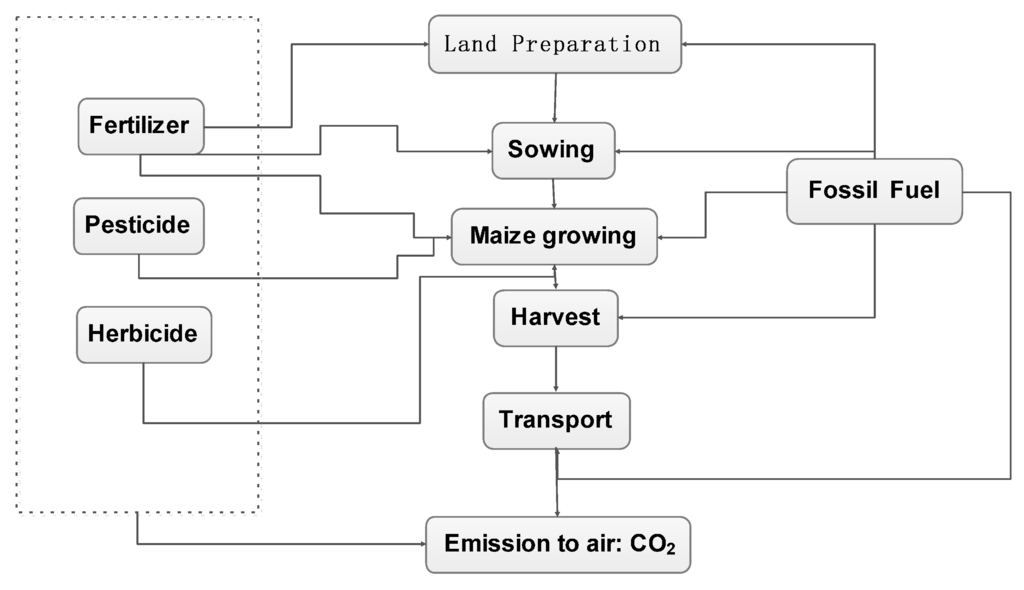 LCA is one of several commonly used environmental management tools that assess a product or service from “cradle to grave”, meaning that every stage of the life cycle is examined, from raw-material acquisition through manufacturing, distribution, use, possible recycling, and until final disposal[5]. LCA methodology is a useful tool for the environmental performance assessment of agricultural production systems, and also for comparing different agricultural production systems from an environmental perspective. Recently, some researchers have quantified the environmental impacts of a multitude of agricultural products [6,7]. Brentrup et al. [8] adopted LCA methodology to appraise sugar beet production using different forms of nitrogen fertilizer. Nie et al. [9] analyzed the effects of different cropping systems using the LCA method. They found that intercropping maize with suitable plants could reduce the adverse effects of the over-application of nitrogen fertilizer on the environment. Wang [4] used LCA methodology to explore the ecological and economic effects of winter grain cultivation in the North Plain and concluded that modernization of grain production will be important in the future. Sahte et al. [10] used the LCA methodology to investigate Ethiopian rose cultivation and refine its nutrient and pesticide management to improve environmental performance. Xu et al. [11] comprehensively analyzed LCA energy consumption and greenhouse gas emissions of China’s six current biofuel pathways. However, to our knowledge, no studies have estimated the carbon footprint of the mechanization of maize production systems based on an LCA methodology. We divided the agricultural process into production steps and analyzed the energy inputs and utilization of each step. The result can be used to improve the mechanization of the maize production system in Northeast China.