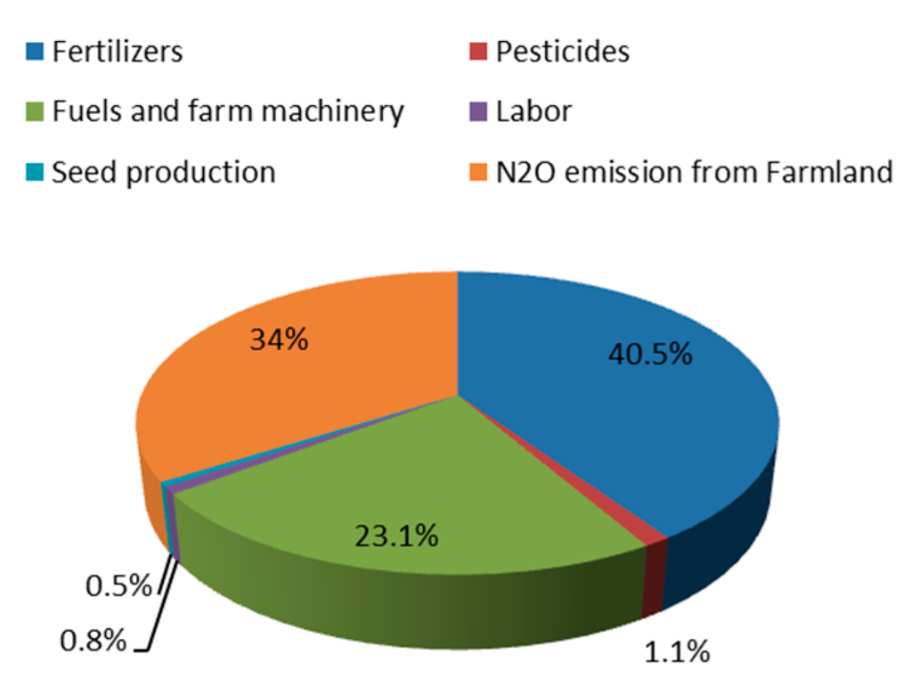 Recent studies have characterized the carbon emissions of crop production in different regions. The studies in [31,32,33] reported results of life cycle emissions of rice production from Californian, Japan, and Italy at 1.551 kgCe/kg, 46 kgCe/kg, and 252–266 kgCe/ha, respectively. Mondelaers et al. [34] estimated the carbon emissions of wheat from Europe and found a value of 0.08 kgCe/kg. Cheng and Han [35] calculated the carbon emissions to 263 kgCe/ha for conventional-till maize in China. However, in our study of maize production, the carbon footprint is generally higher than in other research results. The main reasons for this are as follows: (1) fertilizer was a major contributor, considering that the N fertilizer rate was almost four times higher than in California (107 kg/ha); and (2) soil N2O emissions represent the major carbon emissions associated with fertilizer application, and some study results do not include this component [36].
