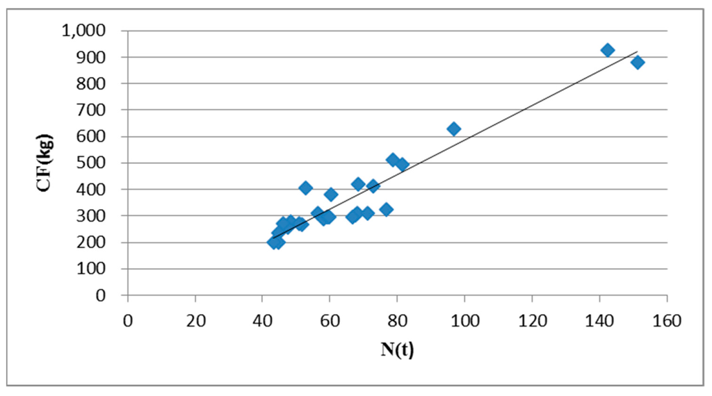 Nitrogen fertilizers released around 36% of the carbon emissions from maize production in 2014. As shown in Figure 3, there is a significant correlation between carbon emissions and nitrogen consumption in Jilin’s maize production between 1985 and 2013, with r = 0.95. It widely understood that increased fertilizer use can increase maize yields. However, as increased amounts of fertilizer were applied, the rate of yield increase reduces until a plateau is reached. In the current circumstances, reducing carbon emissions through reducing fertilizer use would decrease maize production and net financial benefits to farmers; therefore, it is a considerable challenge to reduce carbon emissions in agriculture.
