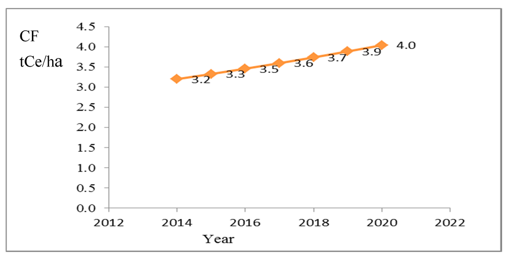 Grey prediction of the carbon footprint during 2014–2020 (tCe/ha).