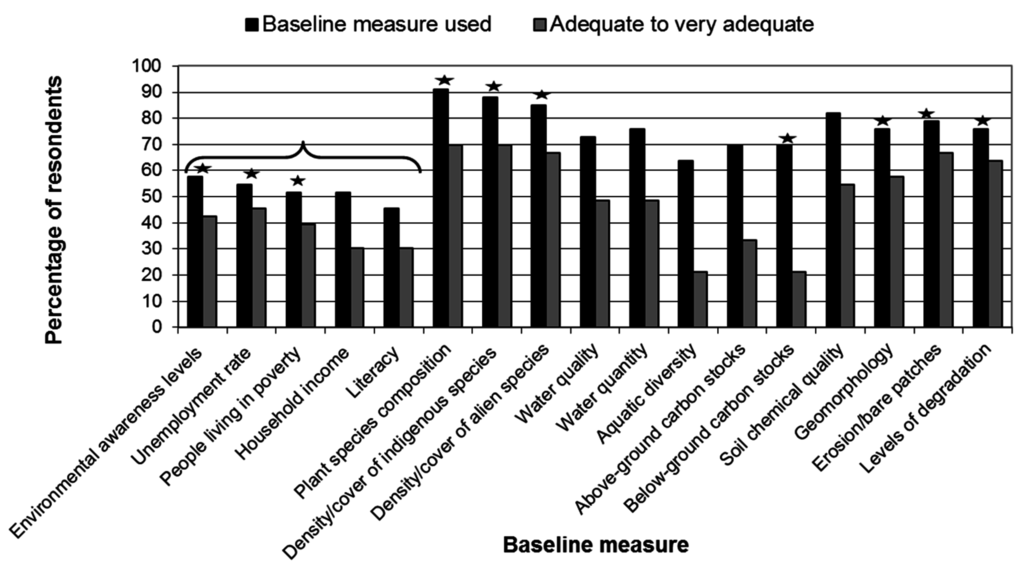 Percentage of respondents who indicated that in their respective projects baseline measures were used (solid black bars) and that information collected on them was adequate to very adequate (grey bars). Stars denote that the proportion of respondents who rated the collection of information for a particular baseline measure as adequate to very adequate was significantly different from an expected 0.5. The bracket denotes socio-economic measures.