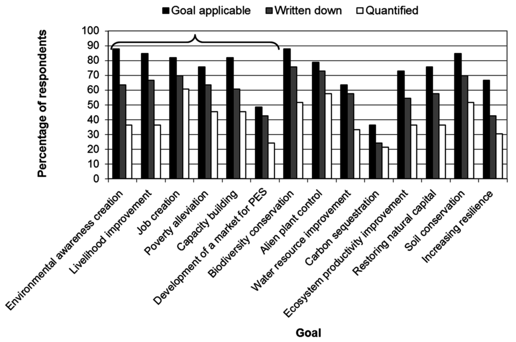Percentage of respondents who identified different restoration goals as applicable to their projects (solid black bars); stated in writing (grey bars) and quantified (clear bars). The bracket denotes socio-economic goals.