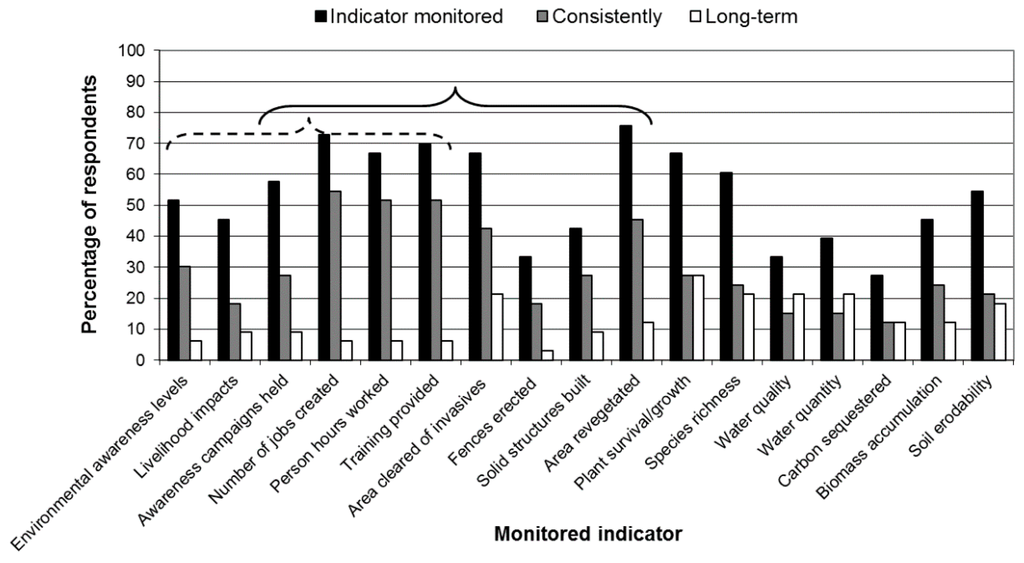 The three most consistently monitored indicators (cited by over 50% of the respondents) were those associated with employment creation and capacity building. Long-term monitoring was limited with 30% or less of the respondents indicating that any of the indicators were monitored beyond the implementation phase. For all the socio-economic indicators, less than 10% of the respondents indicated that they were used in long-term monitoring. Overall, the percentage of respondents identifying any indicator as applicable to their project was always higher than the percentage who indicated that such indicator was monitored consistently and in the long term. The degree of attrition, however, was higher for long term monitoring than for consistent monitoring in all but three indicators (viz: plant survival, water quality and water quantity).