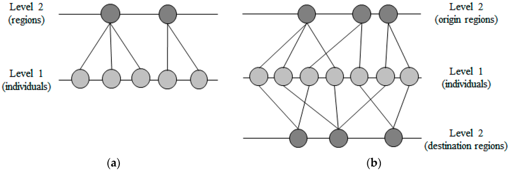 The hierarchical linear modeling allows us to explore the effects of both individual and regional characteristics on interregional migration within a single model. However, migration has a more complex data structure in which the individual level units are cross-classified by two regional level units: origin and destination. Individuals are classified by origin region, that is where they come from, and destination region, where they currently live. Because an individual’s migratory behavior is influenced by individual, as well as origin and destination region characteristics, we adopt a hierarchical cross-classified linear model as our research model (Figure 1b). This is a two-level structure with individuals at Level 1 nested within the cells of the Level 2 cross-classification [59]. A general hierarchical linear model or classical approach is insufficient to treat individuals classified by origin and destination, that is the cross-classification of individuals by region [60]. Thus, the hierarchical cross-classified linear modeling allows us to analyze two-way data and estimate the push effects from the origin region and pull effects from the destination region.