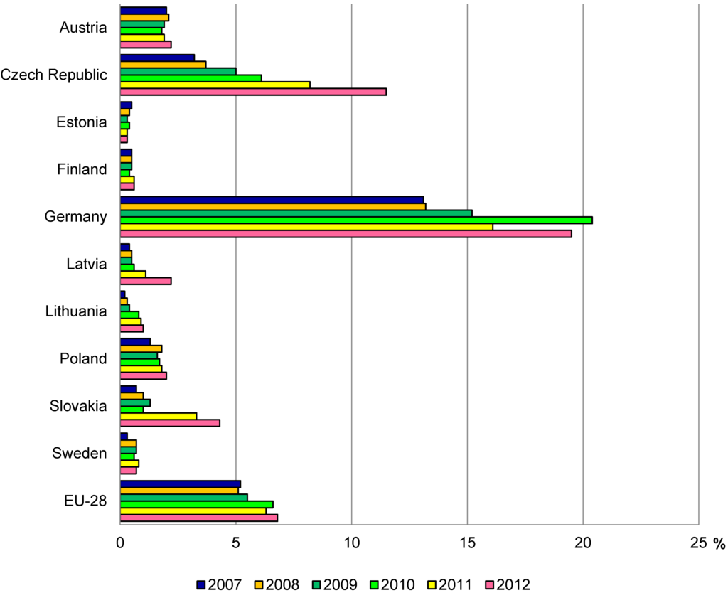 It is worth mentioning that in obtaining energy from renewable sources in general (EU-28), a clear increase is being noted, because in 2003 the proportion of renewable energy obtained was 11.1% of primary energy in general, and in 2012 it was 22.3%. Against this background Poland looks less favorably because in 2012 the share of the obtained renewable energy was 11.7% of the primary energy in general (in 2003 it was 5.2%).
