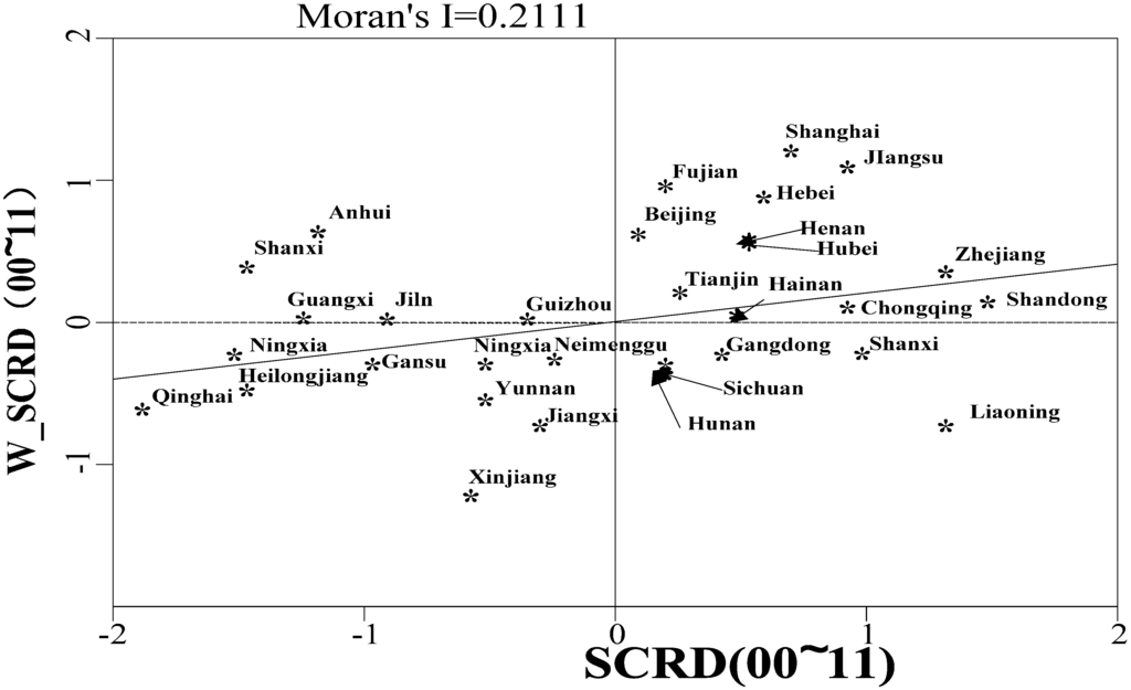 Local scatter map for a province’s proportion of deposits in non-state-owned financial institutions from 2000 to 2011.