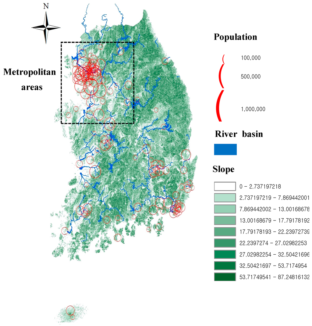Figure 1). Korea is home to 4 rivers—the Han, Nakdong, Geum and Yeongsan—which give rise to 14 major tributaries. The rivers are highly prone to flooding because of their short water course extensions and steep slopes in the mountainous areas. The thin soil cover and low moisture-containing capacity cause frequent weathering and erosion during and after heavy rain. The resulting soil runoff accelerates flood damages. The country’s capital houses 24,988,368 people, nearly half of the Korean population (49.25 percent) [