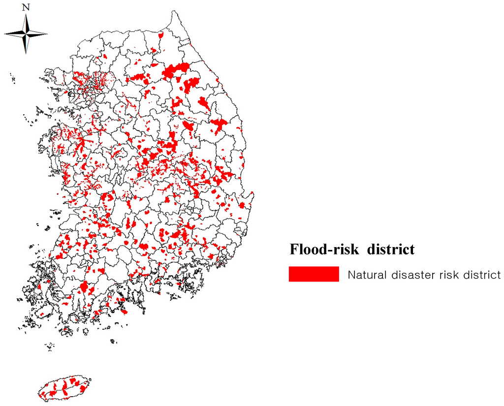 Thus, all the previous studies focused on quantitative and policy implications of flood mitigation measures. However, some of these studies suffer certain limitations. First, while some researchers used appropriate methods to assess the effects of structural measures, the ability of the data to provide comprehensive results is restricted, because the data did not cover important geophysical, social, and economic characteristics. In other words, the geophysical, social, and economic variables employed in these studies did not consider regional variations. In general, such data are difficult to obtain, and as such, they cannot be used to construct indexes. Thus, proxy indexes have been used to generalize the results. Second, it is difficult to verify the effects of non-structural measures because of analytical or design limitations, such as heavy reliance on surveys, the analytical hierarchy process, and/or fragmentary comparative analysis. Third, the existing studies do not implement an analysis of actual proof of flood damage mitigation measures in long-term. There is therefore a need for analytical methods that not only address different aspects of flood damages but also accomplish this with high reliability. Therefore, the objectives of this study are to empirically analyze the characteristics of flood damages in Korea and the effects of flood damage prevention measures employed in the country, both structural and non-structural, on the extent of flood damages.