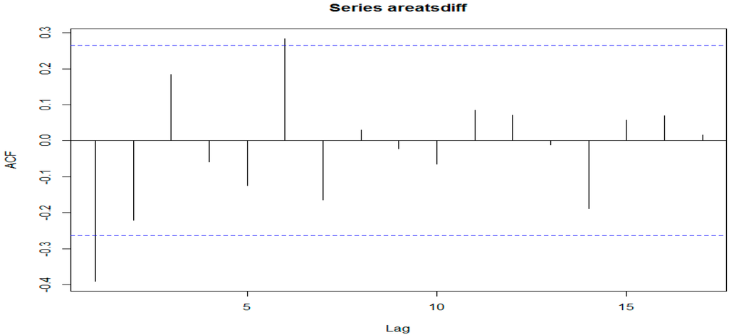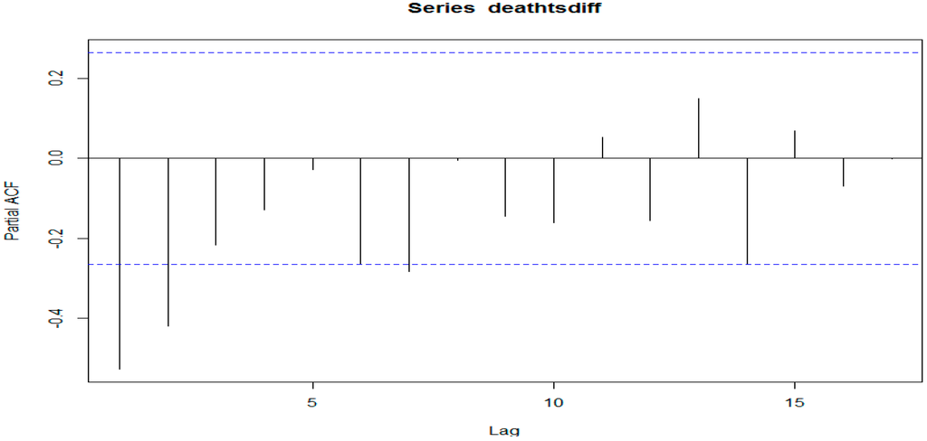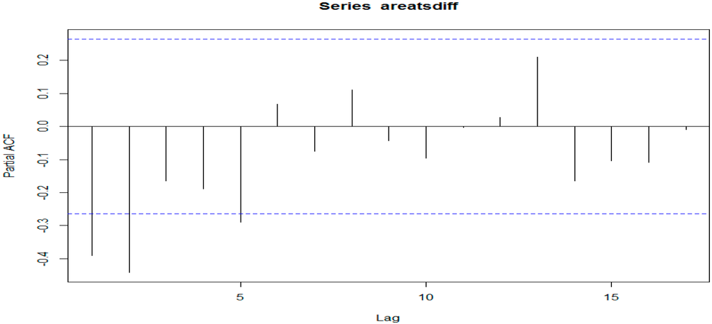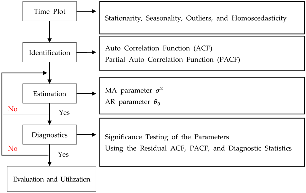 The ARIMA model consists of p past factors (auto-regressive factors) and q confounding factors (moving average factors) with , which represents the integrated elements. Therefore, it is expressed as ARIMA (p, d, q), where p = autoregressive factor, q = moving average factor, and d = difference.