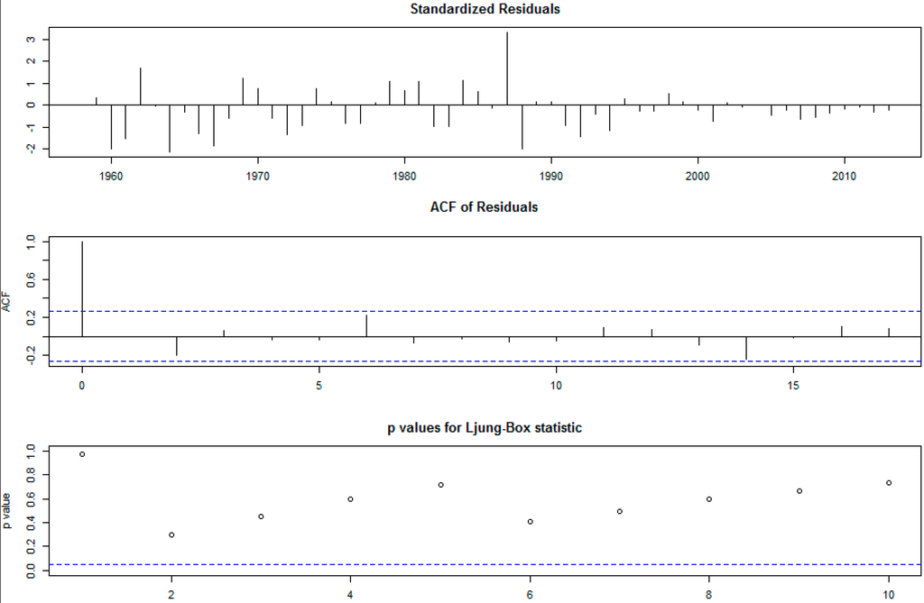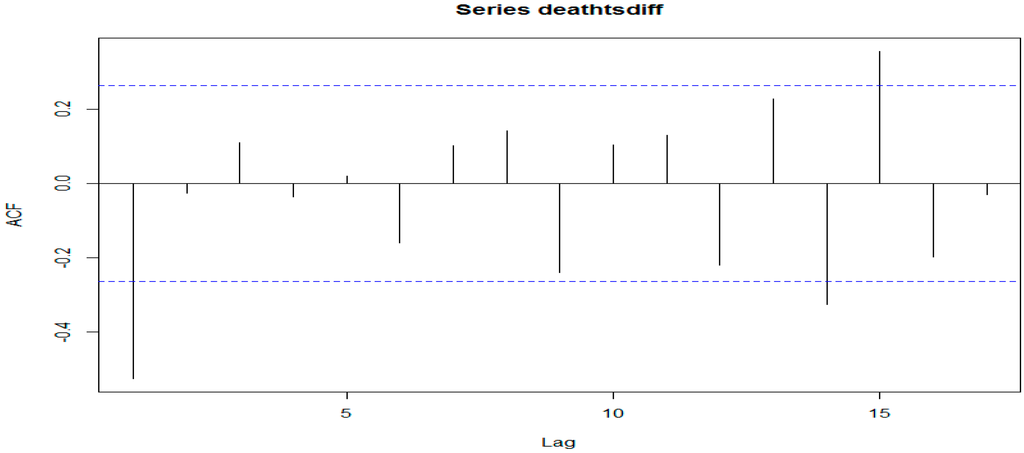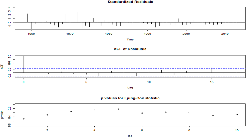 The assessment of the transfer function model is similar to the procedure for the ARIMA model. For estimation and verification of the intervention time series model, statistics are repeated throughout the process of identifying, estimating, and diagnosing the model that reflects the intervening variable,