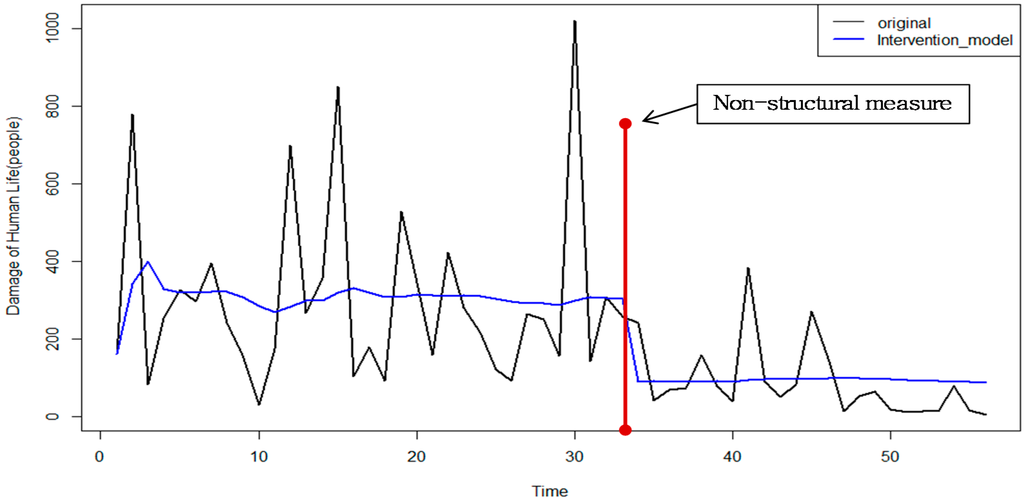 The intervention effects of structural and non-structural measures analyzed using time series data covering the past 55 years were significant. Structural intervention effects emerged slowly in flood-affected areas, whereas the non-structural effects on damages to human life were immediate