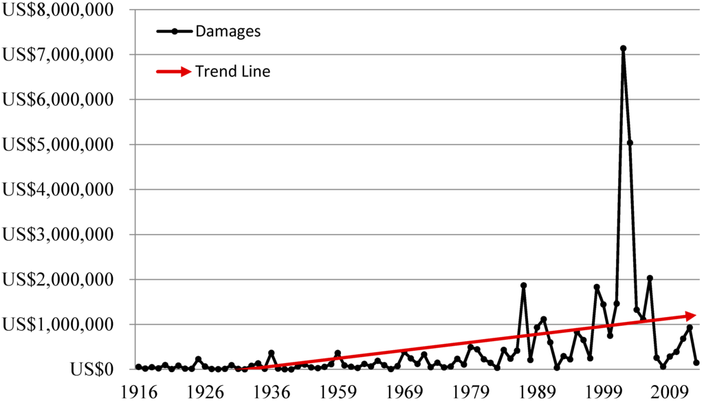 Trend in flood damages from 1916 to 2013, except 1945 to 1957 (conversion basis price in USD, 2013) (source: [