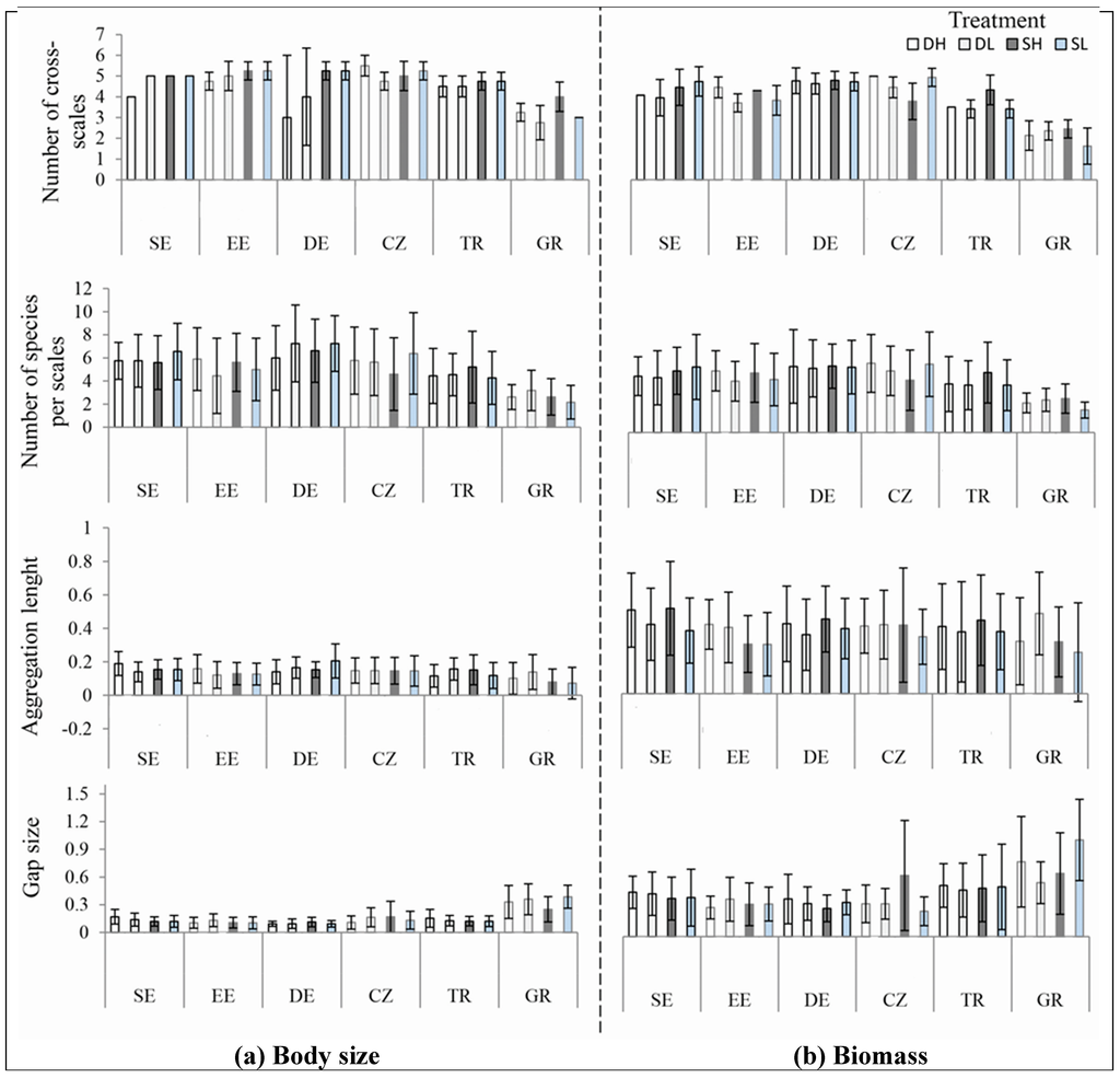 Comparison of cross scale (number of scales) and within scale (number of species per scale), aggregation length and gap size, i.e., four attributes of resilience, derived from (a) zooplankton body size and (b) biomass. Shown are the overall patterns (mean ± standard deviations) for the different countries: SE, Sweden, EE, Estonia; DE, Germany; CZ, Czech Republic; GR, Greece; TR, Turkey.