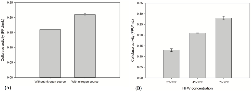 2.1. Evaluation of the Production of Thermophilic Enzymes Using HFW as Raw Material