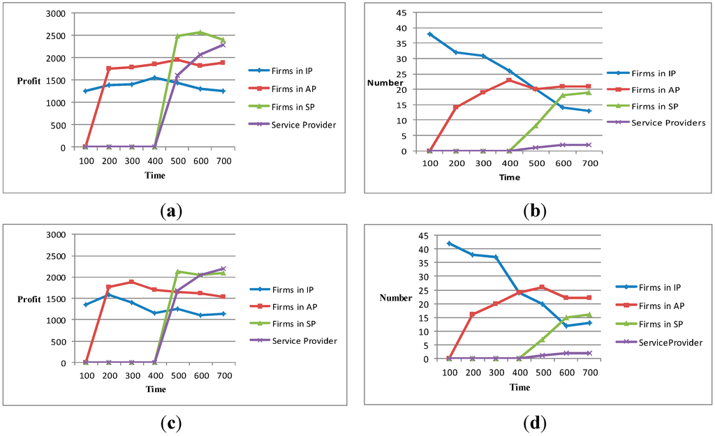 In order to identify the optimal policy, two main performance indicators are adopted in the experiment analysis: (1) the average profit of manufacturers in different procurement patterns; and (2) the number of manufacturers participating in different procurement patterns. The first indicator is used to judge whether the policy can keep the profit balance between service provider and manufacturers so as to realize the sustainable development of service provider. The second indicator is used to judge whether the policy can make service procurement prevail in the three procurement patterns, and attract manufacturers as many as possible.