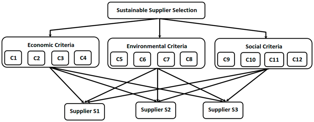 In this proposed study, three possible “qualified” suppliers (S1, S2, S3) are thought to have the potential to support sustainable business operations and engaged for evaluation. The decision making team for evaluating the criteria’s intensity of importance and supplier performance is composed of three experts from the material sourcing department (E1), the production department (E2) and the health and safety department (E3). The hierarchical structure of the decision model is presented in Figure 2. The questionnaire is prepared and distributed among the experts team for evaluation of criteria and suppliers. The expert members are asked to evaluate each criterion using the linguistic scale provided in the questionnaire to determine its intensity and evaluate the supplier’s performance based on the selected criteria. A seven-point Likert scale is provided in the questionnaire to represent the experts perception. The linguistic scale for criteria evaluation and alternative evaluation is presented in Table 2 and Table 3. The TOPSIS methodology is applied to solve the decision making problem. Table 4 and Table 5 display the original assessment of the expert’s opinions on criteria importance and suppliers performance.