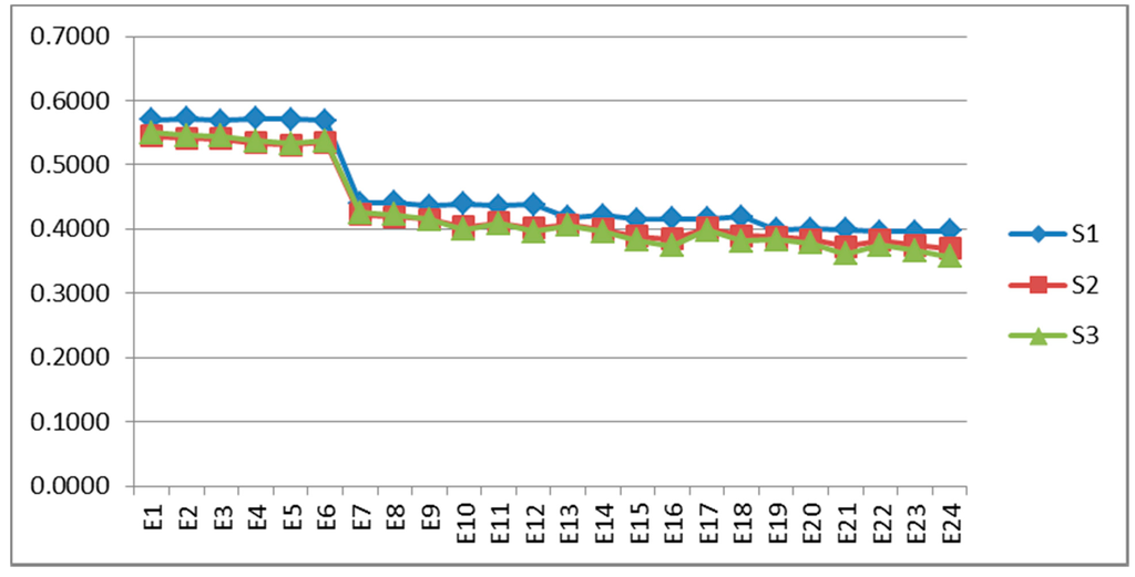 | E24 | (0.7, 0.9, 1) | (0.5, 0.83, 1) | (0.3, 0.63, 1) | (0.1, 0.37, 0.7) | 0.3969 | 0.3699 | 0.3569 | S1 > S2 > S3 |