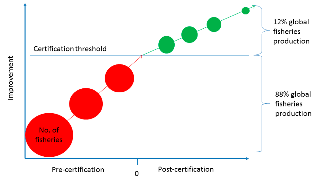 The second main criticism is that the MSC has not led to a measurable reduction of fish stock decline [68] and that overfished stocks continue to be certified [69]. Critics have maintained that, on the one hand, the continual improvement of overall environmental performance has been complicated by an inflexible interpretation of the assessment process and the certification of only the best performing fisheries [64]. In response the MSC has argued that fisheries that receive a cautionary recommendation to proceed to full assessment, or that pass full assessment with conditions, are forced to meet specified requirements set out in monitored action plans [70,71]. This is supplemented by the MSC in its recent impact report [72], which shows that the proportion of fisheries that scores over 80 percent has been increasing since 2008 as the obligatory action plans for the fisheries that scored between 60 and 80 have been completed. However, the report also shows that the largest gains are most likely to be made by the 65% of fisheries that do not even make it through to full assessment (see Figure 1). As summarized by Ponte [61], this has led to a central dilemma for MSC: maintain the stringency required to stimulate continuous improvement in those fisheries that are already certified, but also provide adequate incentives for the worst performing fisheries to enter into an assessment.