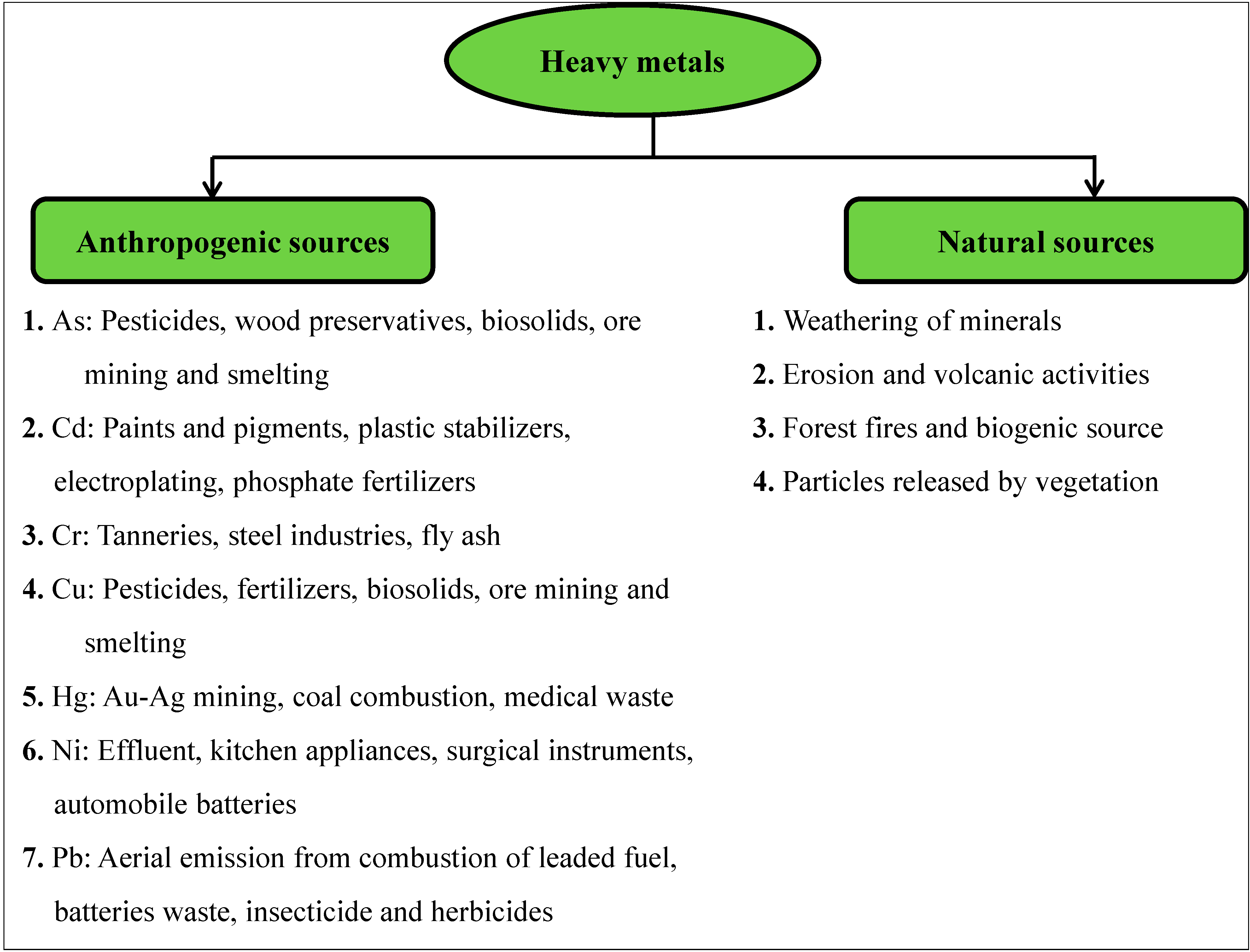 where M is the heavy metal, p is the parent material, a is atmospheric deposition, f is fertilizer source, ag is agrochemical source, ow is organic waste source, ip is inorganic pollutant, cr is crop removal and l is losses by leaching, volatilization and other processes. It is estimated that emission of several heavy metals in atmosphere from anthropogenic sources is one to three orders higher than natural sources [50].
