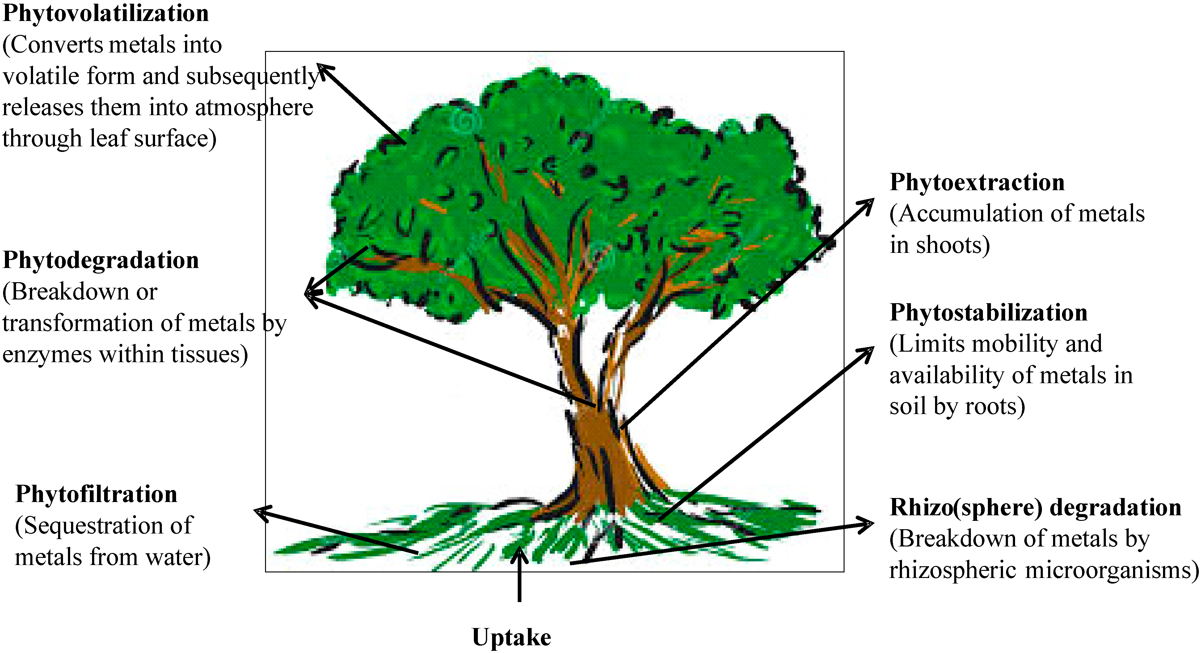 Phytoremediation basically refers to the use of plants and associated microorganisms to partially or completely remediate selected contaminants from soil, sludge, sediments, wastewater and ground water. It can be used for removal of radionuclides, organic pollutants as well as heavy metals [92]. Phytoremediation utilizes a variety of plant processes and the physical characteristics of plants to aid in remediation of contaminated sites. Over the recent years, a special emphasis has been placed on phytoremediation since this property can be exploited for remediation of heavy metal polluted soils [93,94]. It is a cost-effective, efficient and eco-friendly in situ remediation technology driven by solar energy. The technique of phytoremediation includes a number of different processes such as phytoextraction, phytofiltration, phytostabilization, phytovolatilization and phytodegradation [95]. A summary of various processes involved in the phytoremediation of heavy metals is shown in Figure 2. The initial step of phytoremediation is phytoextraction, the uptake of contaminants from soil or water by plant roots and their translocation to and accumulation in biomass, i.e., shoots [96]. Translocation of metals to shoots is an important biochemical process and is desirable in an effective phytoextraction. The next important process of phytoremediation is phytofiltration, which includes rhizofiltration (use of plant roots), blastofiltration (use of seedlings) or caulofiltration (use of excised plant shoots) [97]. In this, the metals are absorbed or adsorbed and thus their movement in underground water is minimized. In addition to the above process, phytostabilization or phytoimmobilization occurs, which reduces the mobility and bioavailability of metals in the environment and thus prevents their migration into groundwater or the food chain [98]. Plants perform the immobilization of heavy metals in soils by sorption through roots, precipitation, complex formation or metal valence reduction in the rhizosphere [99]. Organic pollutants taken by plants are metabolized by enzymes such as dehalogenase and oxygenase, which are not dependent on rhizospheric microorganisms [100]. However, several heavy metals absorbed by plants get converted into volatile forms and subsequently released into the atmosphere by the process called phytovolatilization. This process has been used for removal of some volatile heavy metals like Hg and Se from polluted soils [101]. However, this is limited by the fact that it does not remove the metals completely but rather transfers them from one medium (soil or water) to another (atmosphere) from which they can reenter soil and water.
