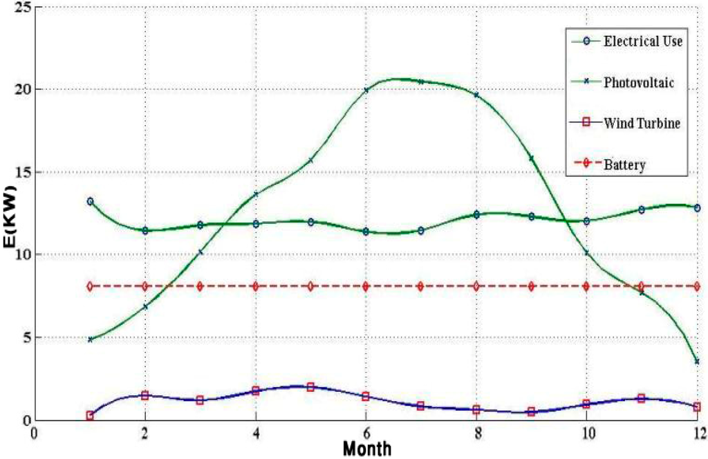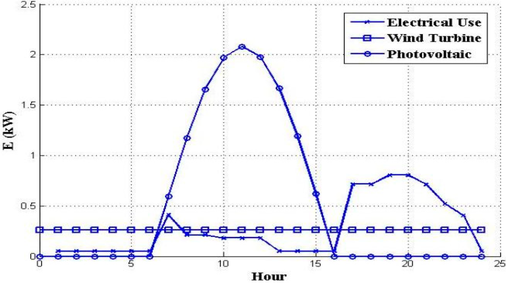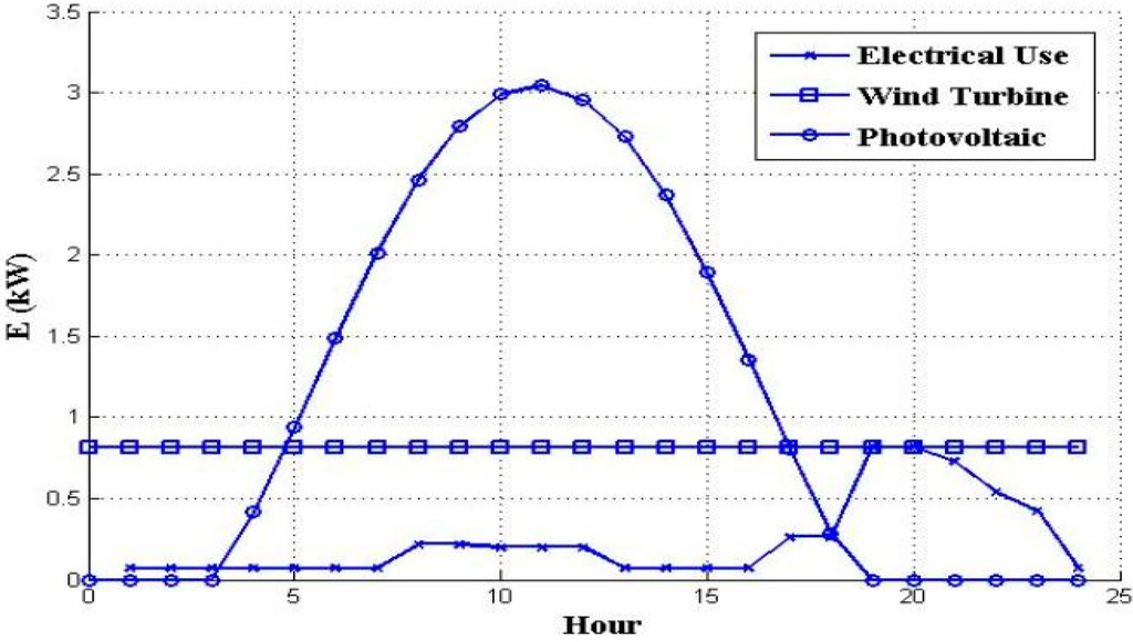 As shown in Figure 5, Figure 6 and Figure 7 the electrical output of the wind turbine and photovoltaic cell covers 24 h of the day for three of the months. In all of them our system can supply the electrical needs.