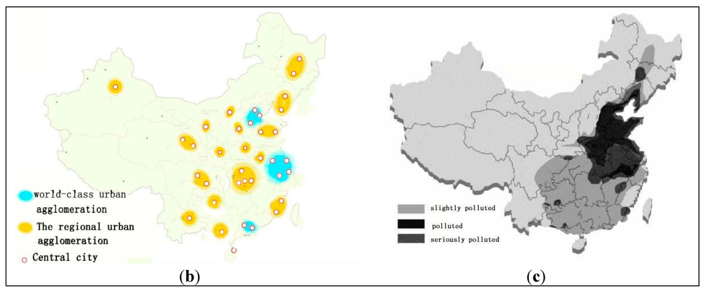 The relationship between AQI (Air Quality Index) and urbanization in China. (a) Population distribution; (b) Urban agglomeration distribution; (c) Air pollution in China.