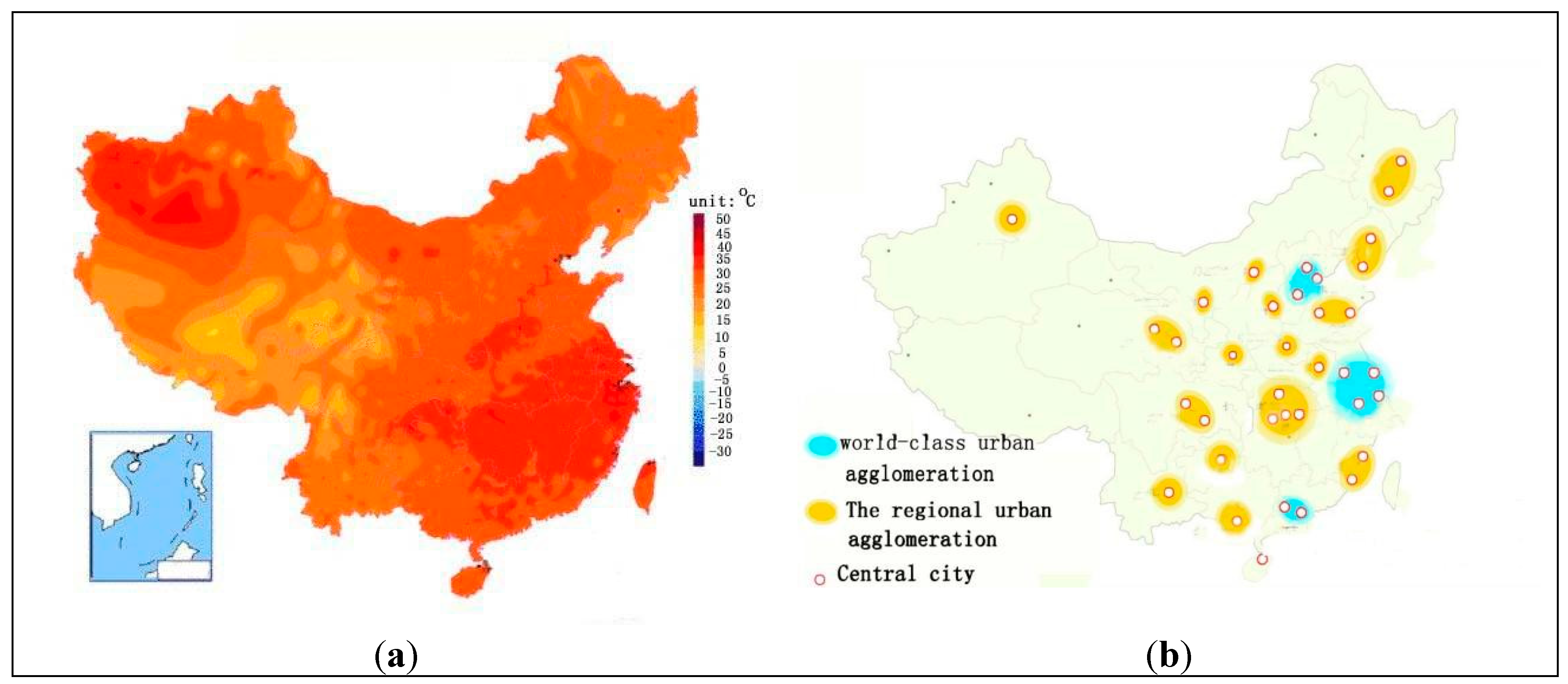 The relationship between temperature and urbanization in China. (a) Temperature distribution; (b) Urban agglomeration distribution.