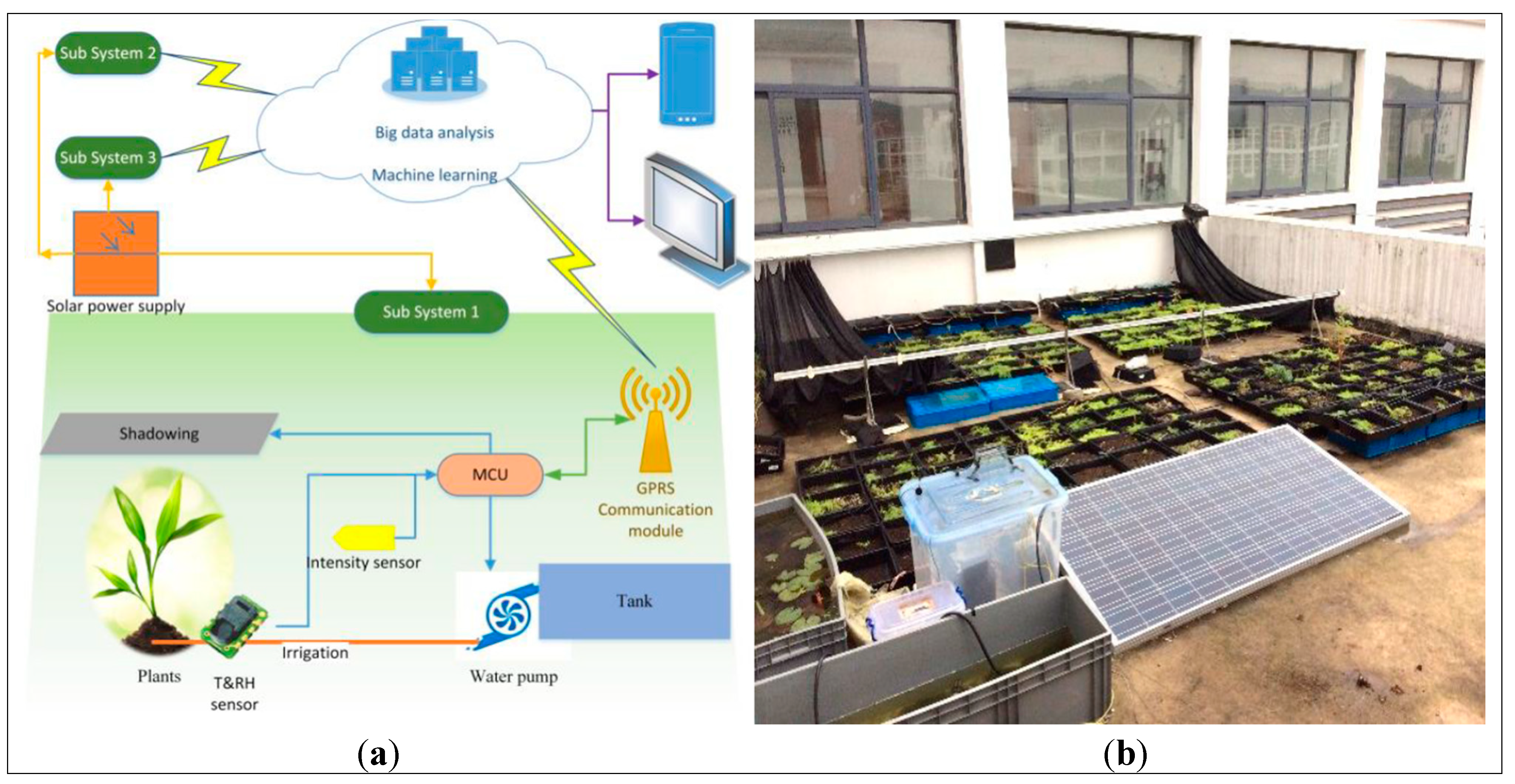 The GRM system, as shown in Figure 3, is a complete self-maintenance system controlled by electrical devices. Manual control is also available when necessary. As seen in Figure 3a, all devices in this system are powered by solar energy to avoid additional energy cost and rain water is conserved for future irrigation, targeting at water consumption reduction. A series of operating parameters, i.e., temperature, humility and light are measured and transmitted via the GPRS before reaching the cloud where machine learning is performed. Control command is transmitted backward to the local PCT (Point of Control and Transmission), aiming at irrigation and shadowing.