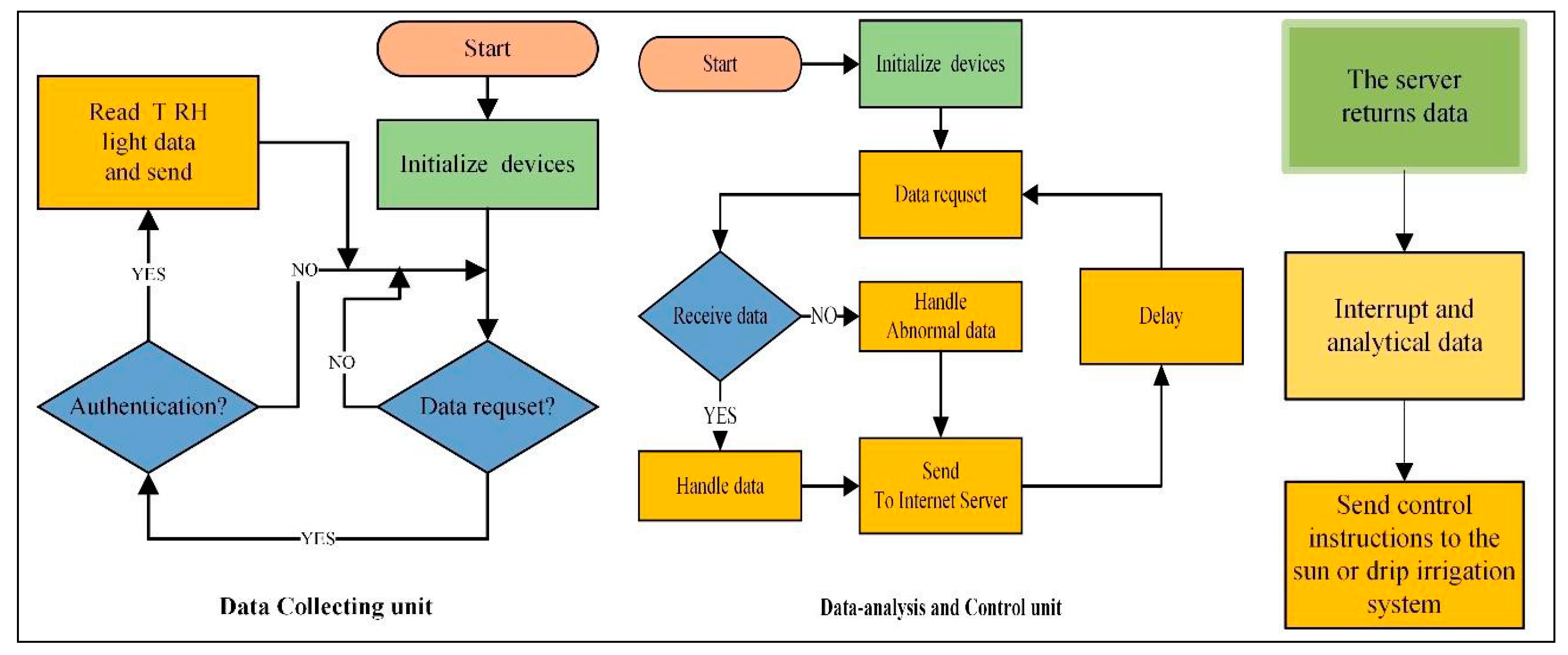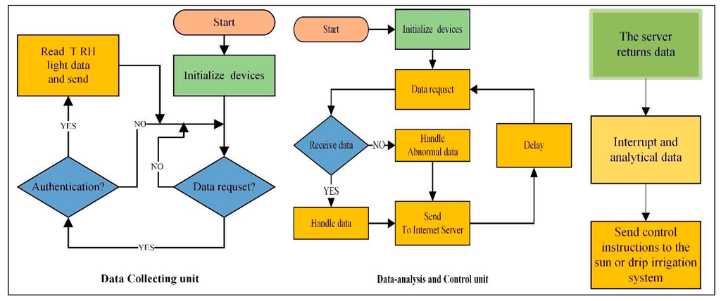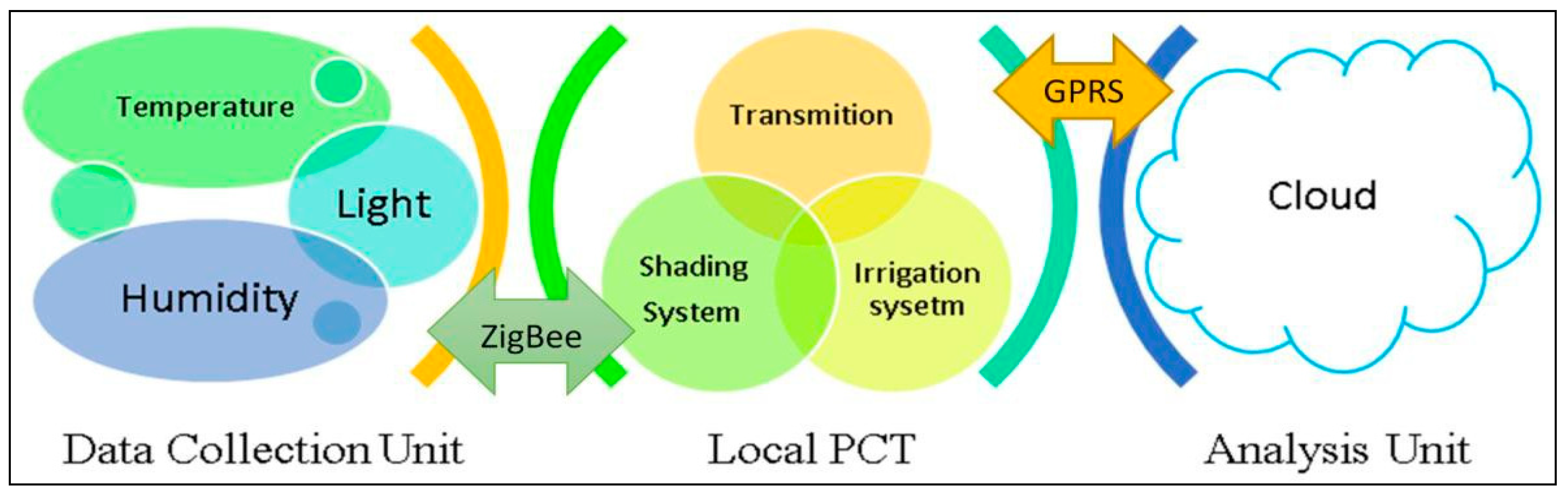 Figure 4 describes the hardware design of the proposed GRM system. As shown, the whole system is composed of the Data Collection Unit, the Local PCT and the Analysis unit. Environment measurements are obtained by the Data Collection Unit before being relayed to the cloud, which conducts information analysis, using data mining and machine learning techniques after which control operations are transmitted backward to the local PCT so that corresponding equipment can be controlled, aiming at irrigation and shadowing.