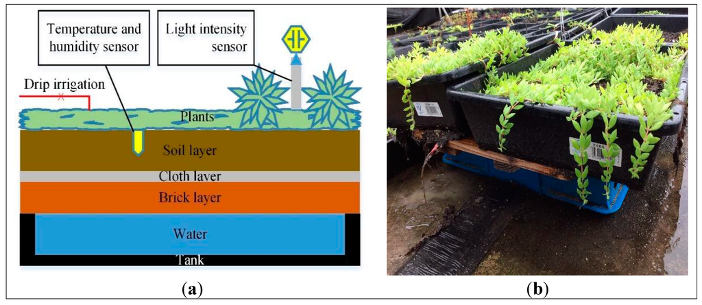 The structure of the pot where we plant vegetation is shown in Figure 6. As depicted, there exists three layers a soil layer, a cloth layer and a brick layer. The soil layer provides living substrate for vegetation and peat is adopted in our experiment. The cloth layer filters the water while preventing the soil from loss. The brick layer, which is composed of tiny brick and perlite, is capable of maintaining humidity as long as the substrate becomes dry. Besides, it can also drain water off quickly in case of rainstorm. The water tank underneath stores water for irrigation and avoids leak of water which is harmful for the structure of roofs. Sensors of temperature and humidity are placed between the soil layer and the cloth layer to provide information for substrate conditions. There are several species of plants, including Sedum sarmentosum Bunge, Lolium perenne L., Capsicum annuum L. and Portulaca grandiflora, being tested for comparison. Local plants are adopted since they are well-adjusted to local environment.