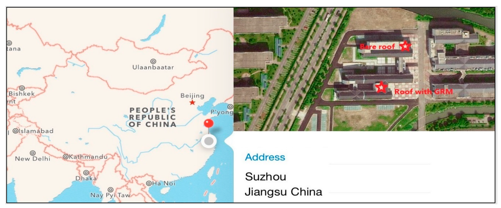 The experiment was conducted since 15 June 2014 which is the hottest season in China. Two sites, marked in red, are selected for measurements in Suzhou China, as given in Figure 7, and each site covers an area of 49 square (7 m × 7 m). The fields labeled with “Roof with GRM” and “Bare roof” denote site with and without our green roof system respectively. There is marginal difference between those two sites in terms of sun radiation, altitude and humidity so that site induced bias can be reduced as much as possible. One thing to note is that observed thermal effects are quite similar in the period of three month. For the sake of space, only out-coming in August is itemized in this paper.