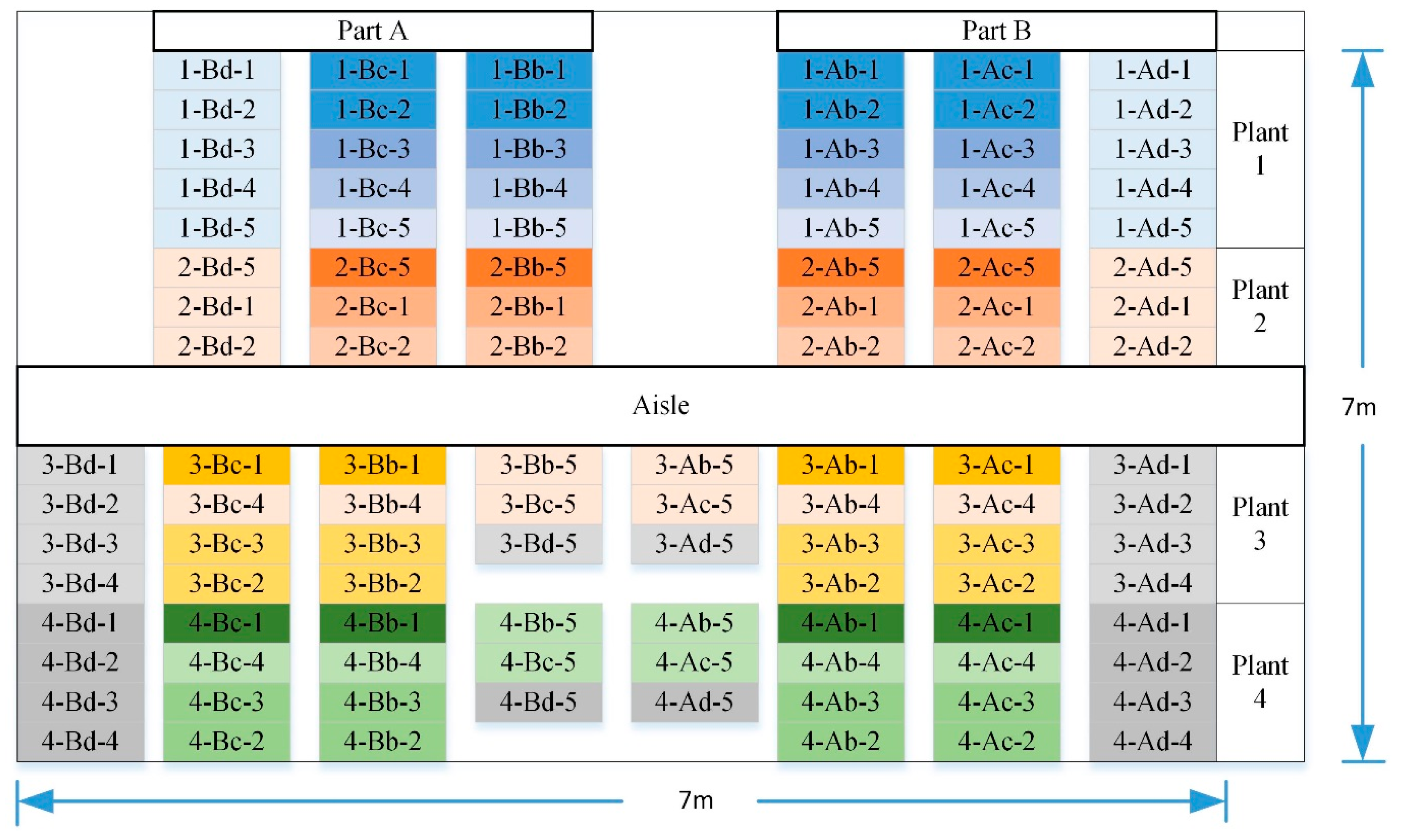 The experimental layout in the “Roof with GRM” is shown in Figure 8 where the depth of substrate are 3 cm, 6 cm and 9 cm respectively in our research since they are benchmarks in most studies. Pots, whose dimensions are 355 mm × 280 mm, are placed in each block and labeled in the form “*-**-*”. The category of plants is distinguished by the first number where 1 represents Sedum sarmentosum Bunge, 2 denotes Lolium perenne L., 3 is Capsicum annuum L. and 4 symbolizes Portulaca grandiflora. We have 108 pots totally in the “Roof with GRM”. The following two characters denote management method where A is shadowed, B represents non-shadowed, b denotes irrigated, c means irrigated and siphoned, d denotes siphoned only and e is irrigated manually. By “siphoned”, we mean that the water in the tank and the substrate is bridged so that the dry substrate is able to siphon water directly from the tank. Nevertheless, the syphon effect is quite slow and thus the automatic irrigation is still required. Automatic irrigation differs from the manual irrigation in terms of irrigation time and operation model. The former irrigates when necessary while the latter irrigates 3 times per day regularly. The final number indicates the depth of substrate and whether pine needle is covered. The ordered numbers 1 to 5 denote 3 cm depth, 6 cm depth, 3 cm with pine needle covered, 6 cm with pine needle covered and 9 cm with pine needle covered respectively.