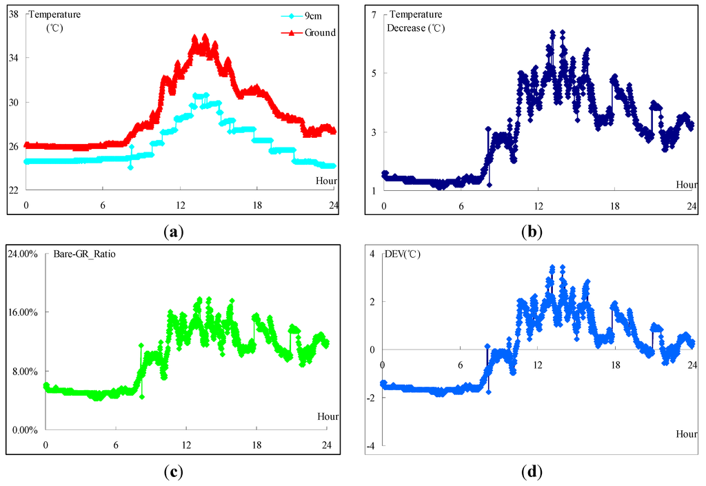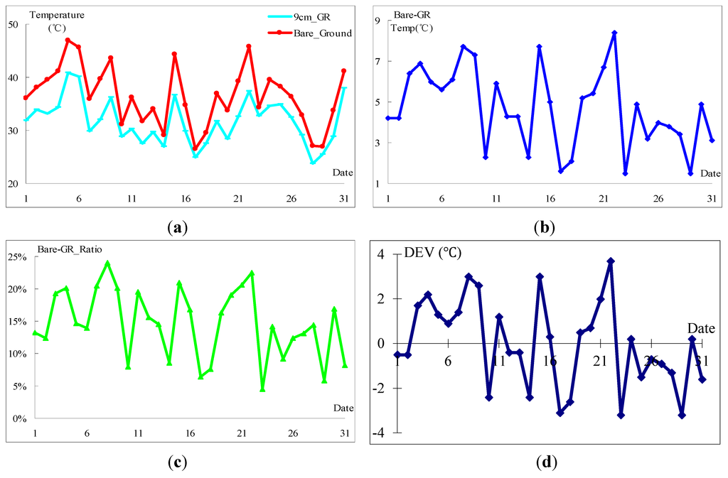 Figure 9 shows the temperature obtained in August 2014. As given in Figure 9a, the temperature on the bare ground tops at 47 °C in several days and bottoms at 28 °C in 17th August. Figure 9b reveals the absolute temperature decrease after the GRM system is implemented. As given, the GRM system is able to reduce as much as 8.4 °C and the average temperature decrease is 4.7 °C. On the contrary, Figure 9c outlines the comparative thermal condition improvement where the Bare-GR_Ratio fluctuates between 4.5% and 24% and averages at 12%. Figure 9d offers the thermal effects deviation derived from Equation (3). As seen, several points fall below the average temperature reduction levels and the key reason is that it is cloudy or rainy all these days.