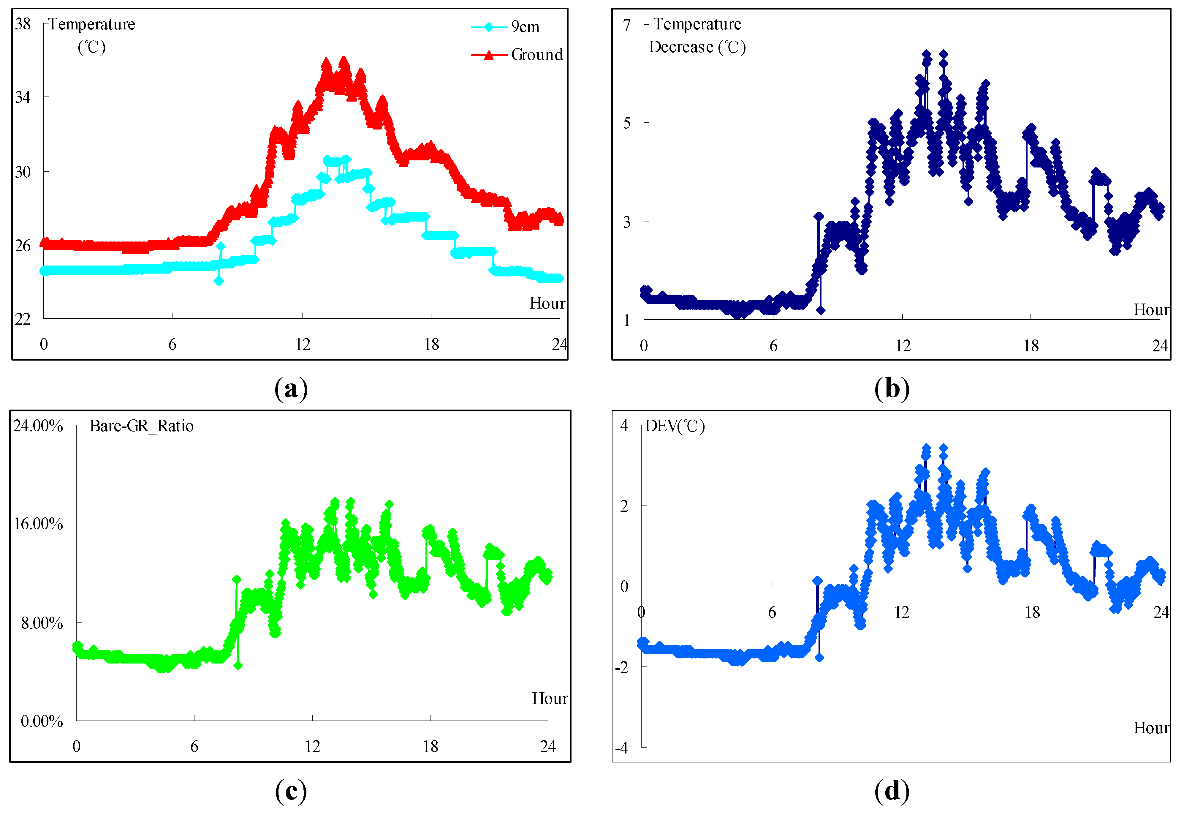 To explore the effects of the roof with GRM explicitly, we depict the thermal conditions on 24 August 2014 in Figure 10. It is clearly that the GRM system has positive cooling effect, especially at noon when the solar radiation is intensive. Figure 10b,c describes the absolute and comparative temperature reduction level of the GRM system. As outlined in Figure 10b, the graph stays between 1 °C and 7.8 °C and averages at 3.5 °C. The cooling effect tops from 13:00 to 16:00 when the outdoor temperature reaches its peak. Results in Figure 10c are obtained through Equation (2) where the Bare-GR_Ratio reminds stable initially until 08:00 and it climbs dramatically over the period of 08:00 and 12:00 before fluctuating in the following periods. Graph in Figure 10d are depicted using results computed via Equation (3). As seen, DEV stays below the average level stably before climbing up to 0, followed by a sharp increase, spanning from 10:00 to 13:00. Fluctuation is witnessed in the following 11 h with a downward trend and it stabilizes at 0 finally. To conclude, the thermal effects reach a peak at daytime.