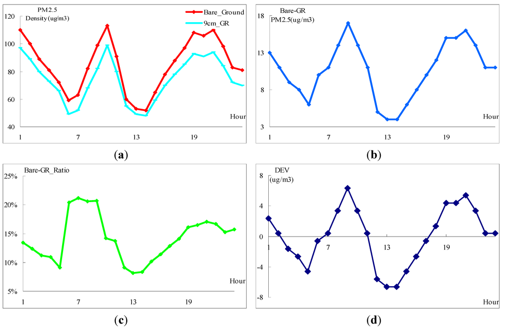 The direct reading monitoring device, Dylos Air Quality Monitors (Model DC1700, with external dimensions of 17.78 cm × 11.43 cm × 7.62 cm) were deployed in two sampling roofs. Two sensors are calibrated beforehand to avoid initialization bias. Measurements are made 10 cm above the ground and the distance between two roofs is 30 m. Two sampling sites are strictly selected to ensure they are far from the PM2.5 sources. Figure 11 shows the density of PM2.5 in two sampling sites with and without the GRM system in 24 August 2014. Curves in both Figure 11a,b fluctuate over the sampling period. Graphs in Figure 11c,d are computed using Equations (2) and (3) respectively. Graph in Figure 11c reminds at the same level except that in the period from 06:00 to 09:00 where it plateaus at 20%. The DEV in Figure 11d fluctuates around the average level. These results suggest that the GRM system may improve air quality in terms of PM2.5 density. Further experiments are needed to confirm this finding, evaluate the local impact of the reduction, and evaluate the role of leaf area in PM removal.
