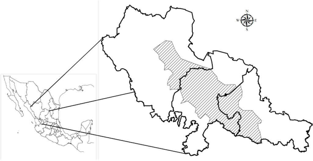 This research was conducted in the dry beans primary region of Mexico (Figure 1), which is located in the Northern region of the country between extreme geographical coordinates 21°30′30.7″N latitude and 100°25′22.5″W longitude, and 21°30′32.6″N latitude and 100°25′23.5″W longitude. The climate is semiarid, with minimum and maximum mean monthly temperatures of 6.5 °C (December and January), and 29.6 °C (May), respectively. Average annual precipitation is approximately 350 mm, of which 80% occurs from June through September.