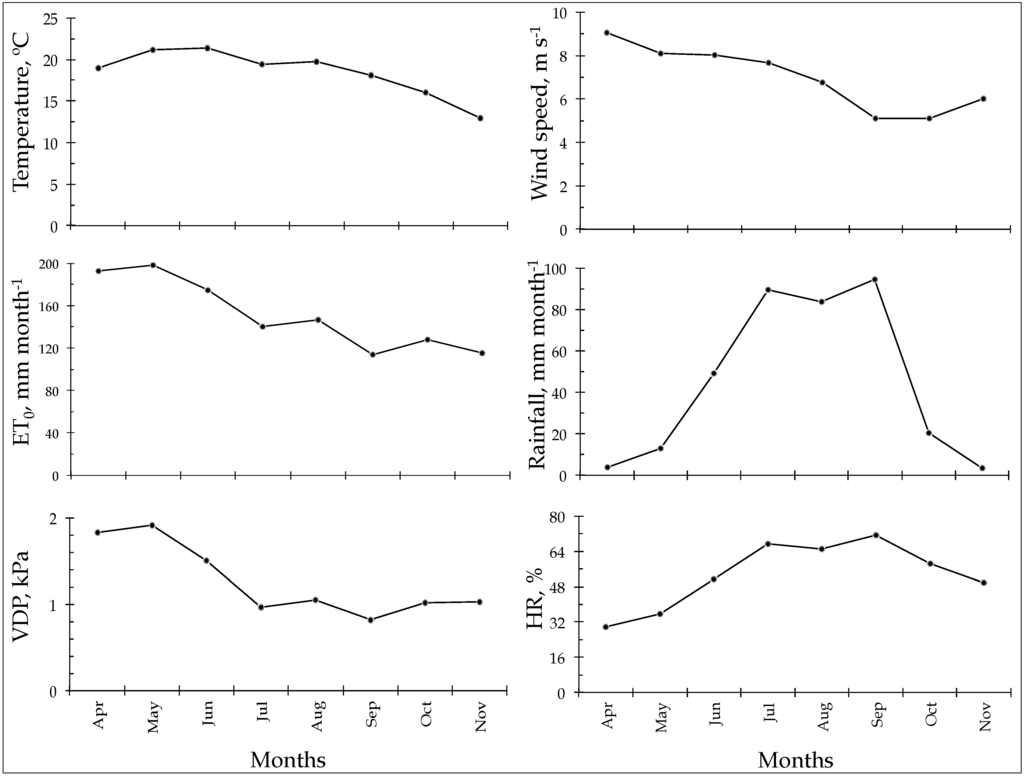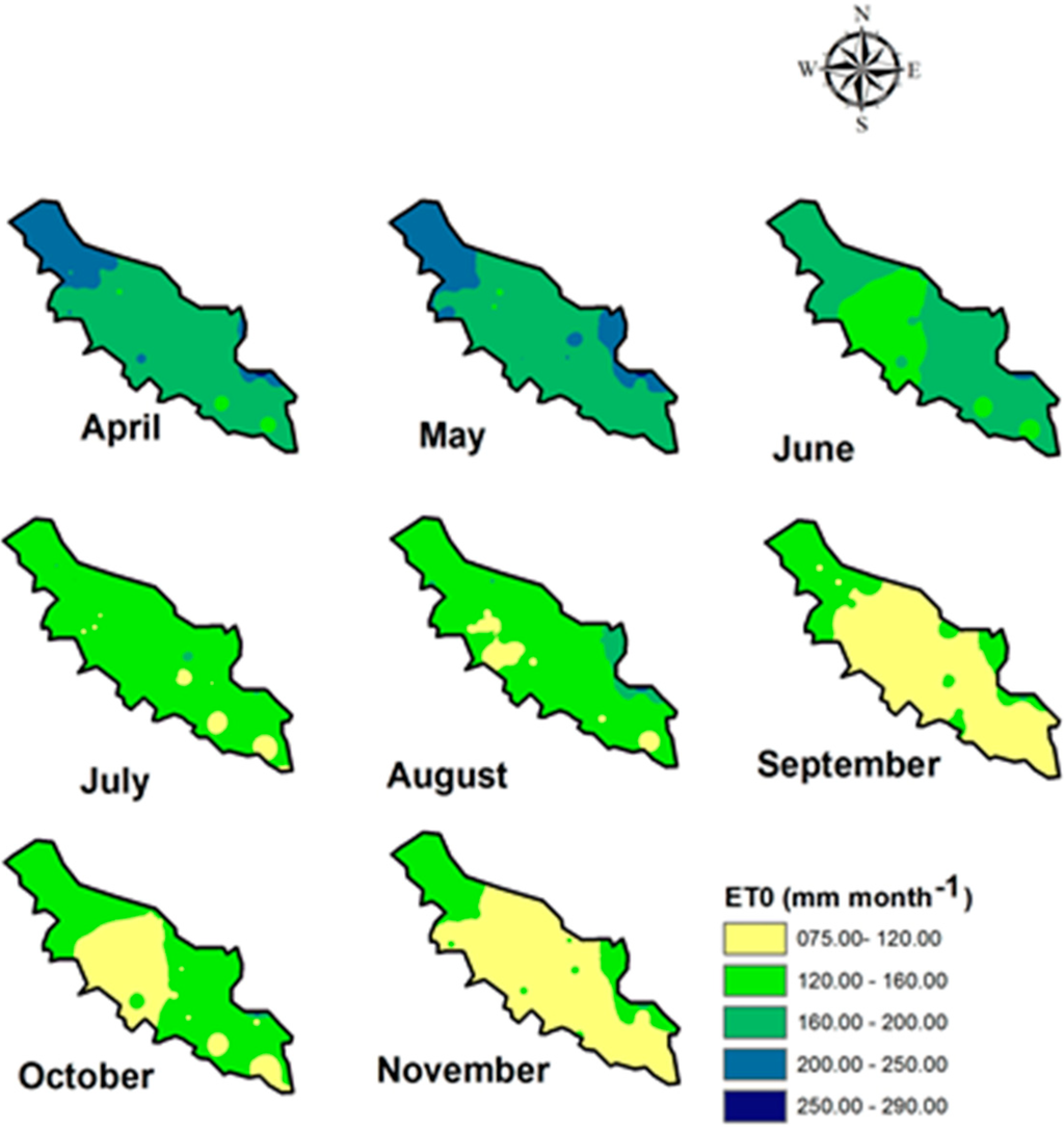 The average meteorological conditions from 2006 to 2011 between April and November are presented in Figure 3, covering the 35 weather stations used in this research. Average air temperature was 18.4 °C; minimum and maximum air temperature values were 10.4 °C and 26.7 °C. Vapor pressure deficit (VPD) ranged between 0.38 and 1.98 kPa, with an average value of 1.27 kPa. Average wind speed was 6.7 m·s−1. Monthly ET0 ranged between 113.4 and 198.1 mm·month−1 in the study period. Daily average ET0 was 5.03 mm·day−1. The total average rainfall was 358.3 mm. The minimum and maximum average rainfall were 3.5 mm·month−1 in November and 94.5 mm·month−1 in September. A large share of precipitation occurred from June to September (88.6%). Figure 4 and Figure 5 present the time evolution of average ET0 from April to November (covering the crop season). According to information plotted in Figure 4, the lowest ET0 values were found between the months of September and November (75–120 mm·month−1), representing only 40% of the ET0 computed for the period April to May (200–290 mm·month−1), when the highest ET0 values were recorded. Figure 5 shows the average monthly rainfall in the crop Primary Region of Mexico. The maximum precipitation values were observed in July, August, and September (35–175 mm·month−1), while April, May and November accounted for 11.1% of the maximum monthly precipitation value. Regarding the spatial distribution of ET0, this variable was relatively uniform in the analyzed region for the entire studied period. However, in some months (April, May, September, and November) the northwestern region showed an ET0 increase of 29% in relation to the southeastern region (Figure 4). As for the distribution of precipitation, the values obtained in April, May, October, and November are uniformly spread, reaching 70 mm. From July to September, precipitation was relatively lower in the southeastern region, with 35–140 mm vs. 70–175 mm in the northwestern region.